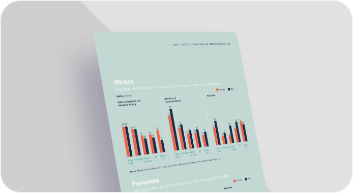 GENDER DIVERSITY IN TODAY’S FINANCIAL SERVICES INDUSTRY | 07 Attrition Early-tenure attrition for women is equal to or lower than it is for men across all subsectors. Attrition, % lost Women Men Asset management and Banking and Insurance wholesale banking consumer finance 18 16 14 14 13 13 13 13 12 12 12 12 11 11 11 11 11 11 11 10 10 10 10 10 10 9 9 9 8 8 Entry Manager Senior VP Senior Entry Manager Senior VP Senior Entry Manager Senior VP Senior level manager VP level manager VP level manager VP Source: Women in the workplace 2017, a joint report from LeanIn.org and McKinsey, 2017, womenintheworkplace.com Promotions Early-tenure women are promoted at lower rates than men across all subsectors. Management promotions, % promoted Women Men Asset management and Banking and Insurance wholesale banking consumer finance 10 9 9 8 8 7 7 7 6 6 6 5 5 5 4 4 4 3 3 3 3 2 2 1 Manager Senior VP Senior Manager Senior VP Senior Manager Senior VP Senior manager VP manager VP manager VP Source: Women in the workplace 2017, a joint report from LeanIn.org and McKinsey, 2017, womenintheworkplace.com