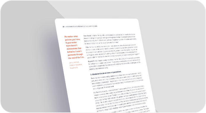 22 | A ROADMAP TO GENDER PARITY AT ALL CAREER STAGES No matter what Sheri Rhodes, chief technology officer at Western Union, recognizes the importance of senior policies you have, leaders inspiring their younger colleagues through sponsorship: “I’ve been fortunate to have if your senior had sponsorship—from both men and women—throughout my career. I have the responsibility team doesn’t to model that behavior and to be an advocate for change.” demonstrate that While female role models are crucial, both men and women should serve as sponsors and behavior, it won’t mentors to ensure that women build the diverse networks they need throughout their careers. permeate through If sponsorship and networking groups involve only women, Karen Peetz notes, they can “un- the rest of the firm. wittingly be viewed as some kind of fringe effort. It’s a best practice to have heterogenous groups, with men involved as mentors, coming to programs, and demonstrating their support.” Jenny Johnson, Beyond formal programs, companies should monitor the quality of and access to sponsorship Franklin Templeton for both junior and senior-level women. For example, a best practice is to send out an annual Investments sponsorship survey to identify sponsors and candidates for sponsorship, so that gaps can be identified and addressed early. 3. Eliminate bias in reviews and promotions. Reducing bias in reviews and promotions would likely boost the lagging promotion rate for entry-level women and help to alleviate senior-level women’s sense that their gender has hindered their advancement. This perception is not misplaced: as noted earlier, entry-level women in financial services are 24 percent less likely than their male peers to be promoted, versus 18 percent of women overall. It is therefore especially important for the financial services industry to address the biases— often unconscious—that are holding back female talent. While 79 percent of companies in the financial services sector offer unconscious bias training, only 18 percent require it. Uncon- scious bias training must tackle not only gender, but race, sexual orientation, and other forms of bias. This is particularly critical given the double bias women of color face. Such training can increase inclusiveness for all people. Effective intervention requires going beyond merely helping individuals recognize bias to providing them with the tools to address bias head on, particularly in high-stakes situations like hiring, performance, and promotion discussions. A commitment to addressing unconscious bias needs to come from the top to be effective. Jenny Johnson, president and COO at Franklin Templeton Investments, confirms, “No matter what policies you have, if your senior team doesn’t demonstrate that behavior, it won’t perme- ate through the rest of the firm. From the CEO down, we encourage everybody to take uncon- scious bias training, and then we track the number of people who do it.” 4. Give employees the flexibility to balance work and family. Our interviews have highlighted the common perception that the financial services field is less conducive to work-life balance; in fact, challenges in balancing work and family are the num- ber one reason senior-level women do not strive to become a top executive. To address this, financial services companies must find ways to offer more flexibility in the workplace. Flexibil- ity programs are common across the financial sector: currently nearly 90 percent of financial services companies offer extended maternity and/or paternity leave, and 92 percent offer flexible work policies. However, our research shows that women—especially senior-level women—fear that partaking in flexibility programs may hinder their advancement.
