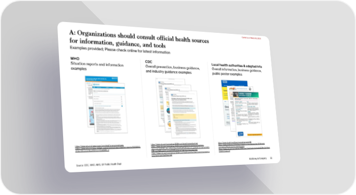 Current as of March 16, 2020 A: Organizations should consult official health sources for information, guidance, and tools Examples provided; Please check online for latest information WHO CDC Local health authorities & adapted info Situation reports and information Overall prevention, business guidance, Overall information, business guidance, examples and industry guidance examples public poster examples https://www.who.int/news-room/q-a-detail/q-a-coronaviruses https://www.cdc.gov/coronavirus/2019-ncov/about/prevention.html https://www.nhs.uk/conditions/coronavirus-covid-19/ https://www.who.int/docs/default-source/coronaviruse/situation-reports/20200310- https://www.cdc.gov/coronavirus/2019-ncov/community/guidance-business- https://www.sfcdcp.org/infectious-diseases-a-to-z/coronavirus-2019-novel- sitrep-50-covid-19.pdf?sfvrsn=55e904fb_2 response.html?CDC_AA_refVal=https%3A%2F%2Fwww.cdc.gov%2Fcoronavirus%2F2 coronavirus/#links-and-documents-public 019-ncov%2Fspecific-groups%2Fguidance-business-response.html https://www.cdc.gov/coronavirus/2019-ncov/downloads/sick-with-2019-nCoV-fact- https://www.cdc.gov/coronavirus/2019-ncov/healthcare-facilities/prevent-spread-in- sheet-chinese.pdf long-term-care-facilities.html Source: CDC, WHO, NHS, SF Public Health Dept McKinsey & Company 22