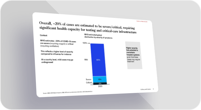 Current as of March 16, 2020 Overall, ~20% of cases are estimated to be severe/critical, requiring significant health capacity for testing and critical-care infrastructure WHO estimated global Context distribution by severity of symptoms WHO estimates ~20% of COVID-19 cases 100% are severe (requiring oxygen) or critical (requiring ventilation) Higher severity has potential to This reflects a higher level of severity overwhelm compared to influenza for instance hospital systems given that these At a country level, mild cases may go Mild 80% cases may require undiagnosed treatment Severe 15% Critical 5% 2020 Source: JAMA, WHO March 6 reports, JAMA, WSJ and associated press interviews with Italian physicians McKinsey and Company 9