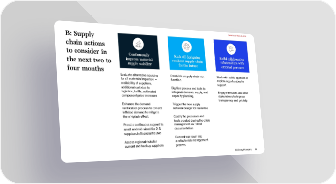 Current as of March 16, 2020 B: Supply chain actions to consider in Continuously Kick off designing Build collaborative the next two to improve material resilient supply chain relationships with four months supply stability for the future external partners Evaluate alternative sourcing Establish a supply chain risk Work with public agencies to for all materials impacted – function explore opportunities for availability of suppliers, support additional cost due to Digitize process and tools to logistics, tariffs, estimated integrate demand, supply, and Engage investors and other component price increases capacity planning stakeholders to improve transparency and get help Enhance the demand Trigger the new supply verification process to correct network design for resilience inflated demand to mitigate the whiplash effect Codify the processes and tools created during the crisis Provide continuous support to management as formal small and mid-sized tier 2-3 documentation suppliers in financial trouble Convert war room into Assess regional risks for a reliable risk management current and backup suppliers process McKinsey & Company 25