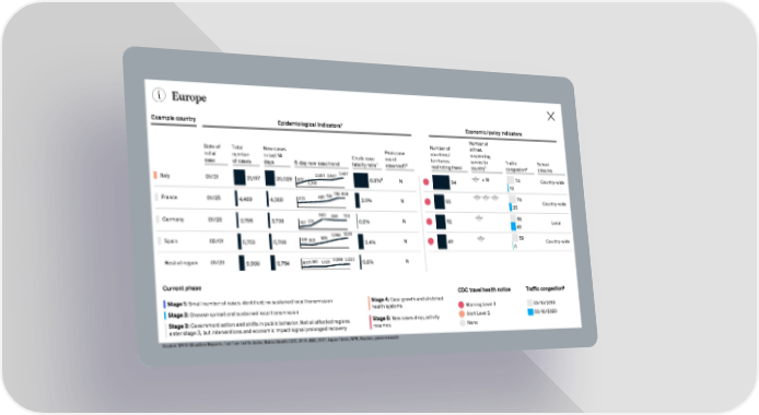 Europe Example country Epidemiological Indicators7 Economic/policy indicators Number of Number of airlines Date of Total New cases Peak case countries/ suspending initial number in last 14 Crude case count territories service to Traffic School 1 2 3 4 case of cases days 5-day new case trend fatality ratio observed? restricting travel country congestion closures 2,651 2,547 3,497 x 18 74 Country-wide 6 Italy 01/31 21,157 20,029 977 2,313 6.8% N 94 10 495 591 780 829 74 France 01/25 4,469 4,369 372 2.0% N 55 Country-wide 25 802 693 733 56 Germany 01/28 3,795 3,738 157 271 0.2% N 52 45 Local 825 1,266 1,522 59 Spain 02/01 5,753 5,708 615 501 2.4% N 49 Country-wide 5 Rest of region 01/29 9,900 9,754 8771,192 1,125 2,086 2,222 0.6% N Current phase CDC travel health notice Traffic congestion5 Stage 1: Stage 4: Small number of cases identified; no sustained local transmission Case growth and stretched Stage 2: health systems Warning Level 3 03/16/2019 Disease spread and sustained local transmission Stage 5: Alert Level 2 03/16/2020 Stage 3: New cases drop, activity Government action and shifts in public behavior. Not all affected regions resumes None enter stage 3, but interventions and economic impact signal prolonged recovery Source: WHO Situation Reports, TomTom traffic index, Baidu QianXi, CDC, IATA, BBC, NYT, Japan Times, NPR, Reuters, press research McKinsey & Company