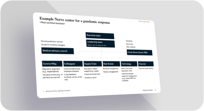 Current as of March 16, 2020 Example Nerve center for a pandemic response Executive team Scenarios Overall guidelines/ policies Leadership team Issue map Guides for frontline managers Medical | Security | Response lead Opercadence Medical advisory council Crisis Nerve Center PMO Comms+Reg Colleagues Supply Chain Real Estate Technology Financial Regulatory alignment Communicate across Disruption, restart Building management Work from home Financial stress-testing (e.g., dispensations) employee channels support (e.g., loans) Factory management execution/ infra 3rd party comms (e.g., to 2 way feedback Exposure across tiers Special employee partners) as required (ombuds, survey, email, Inventory mgmt. segment management call) (e.g., where WFH not possible) 1. Includes procurement, supply chain, and logistics McKinsey & Company 19