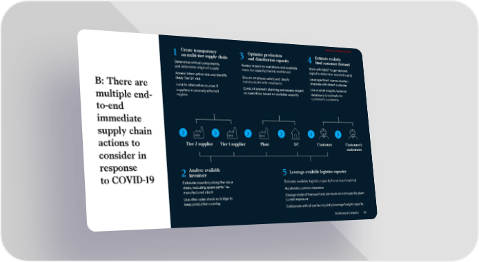 Current as of March 16, 2020 1 Create transparency 3 Optimize production 4 Estimate realistic on multi-tier supply chain and distribution capacity final customer demand Determine critical components, Assess impact on operations and available Work with S&OP to get demand and determine origin of supply resource capacity (mainly workforce) signal to determine required supply Assess interruption risk and identify Ensure employee safety and clearly Leverage direct communication likely Tier 2+ risk communicate with employees channels with direct customer B: There are Look to alternative sources if Conduct scenario planning and assess impact Use market insights/external suppliers in severely affected on operations based on available capacity databases to estimate for multiple end- regions customer’s customers to-end immediate supply chain actions to Tier 2 supplier Tier 1 supplier Plant DC Customer Customer's consider in customers response Analyze available to COVID-19 2 inventory 5 Leverage available logistics capacity Estimate inventory along the value Estimate available logistics capacity for air/sea/road/rail chain, including spare parts/ re- Accelerate customs clearance manufactured stock Use after sales stock as bridge to Change mode of transport and pre-book air/rail capacity given keep production running current exposure Collaborate with all parties to jointly leverage freight capacity McKinsey & Company 24