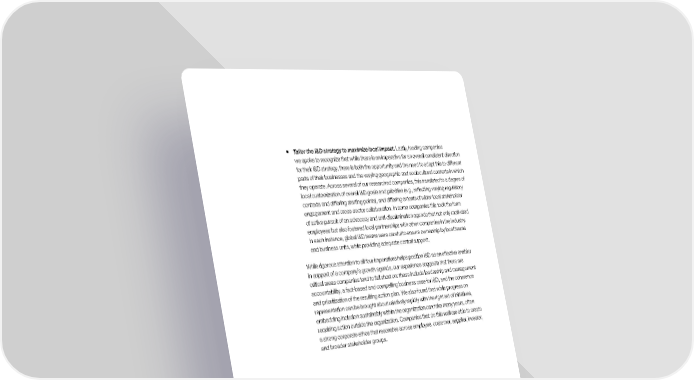 ƒ Tailor the I&D strategy to maximize local impact. Lastly, leading companies we spoke to recognize that while there is an imperative for an overall consistent direction for their I&D strategy, there is both the opportunity and the need to adapt this to different parts of their businesses and the varying geographic and sociocultural contexts in which they operate. Across several of our researched companies, this translated to a degree of local customization of overall I&D goals and priorities (e.g., reflecting varying regulatory contexts and differing starting points), and differing extents of wider local stakeholder engagement and cross-sector collaboration. In some companies this took the form of active pursuit of an advocacy and anti-discrimination agenda that not only motivated employees but also fostered local partnerships with other companies in the industry. In each instance, global I&D teams were careful to ensure ownership by local teams and business units, while providing adequate central support. While rigorous attention to all four imperatives helps position I&D as an effective enabler in support of a company’s growth agenda, our experience suggests that there are critical areas companies tend to fall short on: these include leadership and management accountability, a fact-based and compelling business case for I&D, and the coherence and prioritization of the resulting action plan. We also found that while progress on representation can be brought about relatively rapidly with the right set of initiatives, embedding inclusion sustainably within the organization can take many years, often requiring action outside the organization. Companies that do this well are able to create a strong corporate ethos that resonates across employee, customer, supplier, investor, and broader stakeholder groups. Companies succeeding on I&D are able to articulate the link between their I&D goals and specific business growth priorities. Delivering through Diversity Delivering impact through I&D 28