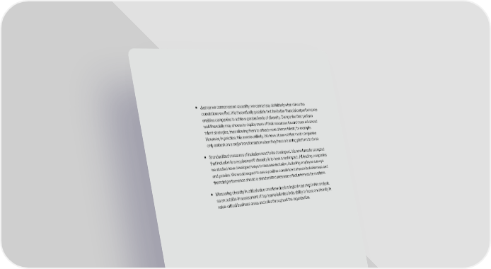 ƒ Just as we cannot assert causality, we cannot say definitively what drives the correlations we find. It is theoretically possible that the better financial outperformance enables companies to achieve greater levels of diversity. Companies that perform well financially may choose to deploy more of their resources toward more advanced talent strategies, thus allowing them to attract more diverse talent, for example. However, in practice, this seems unlikely. We have observed that most companies only embark on a major transformation when they have a burning platform to do so. ƒ Standardized measures of inclusion need to be developed. It is now broadly accepted that inclusion is a requirement if diversity is to have a real impact. All leading companies we studied have developed ways to measure inclusion, including employee surveys and proxies. We would expect to see a positive correlation between inclusiveness and financial performance should a standardized measure of inclusiveness be available. ƒ Measuring diversity in critical value creation roles is a logical next step in this analysis, as an outside-in assessment of top teams is limited in its ability to focus on diversity in value-critical business areas and roles throughout the organization. 39 Delivering through Diversity Methodology