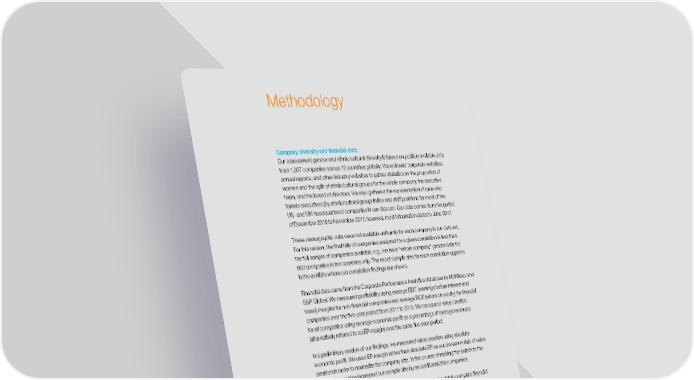 en Methodology Company diversity and financial data Our assessment gender and ethnic/cultural diversity is based on publicly available data from 1,007 companies across 12 countries globally. We reviewed corporate websites, annual reports, and other industry websites to gather statistics on the proportion of women and the split of ethnic/cultural groups for the whole company, the executive team, and the board of directors. We also gathered the representation of male and female executives (by ethnic/cultural group) in line and staff positions for most of the US- and UK-headquartered companies in our data set. Our data comes from the period of December 2016 to November 2017; however, most information dates to June 2017. These demographic data were not available uniformly for each company in our data set. For this reason, the final tally of companies analyzed for a given correlation is less than the full sample of companies available, e.g., we have “whole company” gender data for 663 companies in ten countries only. The exact sample size for each correlation appears in the exhibits where our correlation findings are shown. Financial data came from the Corporate Performance Analytics database by McKinsey and S&P Global. We measured profitability using average EBIT (earnings before interest and taxes) margins for non-financial companies and average ROE (return on equity) for financial companies over the five-year period from 2011 to 2015. We measured value creation for all companies using average economic profit as a percentage of average revenues (alternatively referred to as EP margin) over the same five-year period. In a preliminary version of our findings, we measured value creation using absolute economic profit. We used EP margin rather than absolute EP as our chosen metric of value creation in order to normalize for company size. In the course of making the switch to the EP margin, we also increased our sample size by an additional 350 companies. We limited our data set to those companies for which we could obtain complete financial data – both EBIT (or ROE in the case of financial companies) and EP – and at least one diversity data metric (gender or ethnicity) for at least one level of the organization (whole company, executive, or board of directors). Our observations on other forms of diversity beyond gender and ethnic/cultural diversity, i.e., LGBTQ+ or age/generational diversity, were limited by a lack of access to publicly available representation data. We instead completed qualitative reviews of individual company’s initiatives in these areas. We infer from our qualitative research that the correlations observed on gender and ethnic/cultural diversity would likely hold for others like LGBTQ+ identity. 35 Delivering through Diversity Methodology
