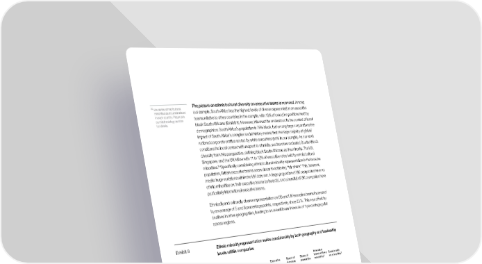 15 The picture on ethnic/cultural diversity on executive teams is nuanced. Among We define ethnic/cultural minorities as it is understood our sample, South Africa has the highest levels of diverse representation on executive in each country. Please see teams relative to other countries in the sample, with 16% of executive positions held by our Methodology section for details. black South Africans (Exhibit 8). However, this must be understood in the context of local demographics: South Africa’s population is 79% black, but among large corporations the impact of South Africa’s complex social history means that the large majority of global/ national corporate entities are led by white executives (69% in our sample). As our work considers the local context with respect to ethnicity, we therefore evaluated South Africa’s diversity from this perspective, defining black South Africans as the minority. The US, Singapore, and the UK follow with 11 to 12% of executive roles held by ethnic/cultural 15 Specifically considering ethnic/cultural minority representation in the broader minorities. population, British executive teams seem closer to achieving “fair share.” This, however, masks huge variations within the UK data set. A large proportion of UK companies have no ethnic minorities on their executive teams (or boards), and a handful of UK companies have particularly international executive teams. Ethnically and culturally diverse representation on US and UK executive teams increased by an average of 5 and 6 percentage points, respectively, since 2014. This was offset by declines in other geographies, leading to an overall lower increase of 1 percentage point across regions. Exhibit 8 Ethnic minority representation varies considerably by both geography and leadership levels within companies Executive Executive Board of Share of teams with no Boards with team directors population minorities2 no minorities2 79 21 0 16 32 Average % 39 32 16 ethnic/cultural 12 15 minority representation by company level1 13 20 20 12 10 13 56 59 11 7 1 See Methodology section for the definition of ethnic diversity and countries covered 2 Percentage of companies with zero ethnic/cultural minorities represented at the executive level SOURCE: Government of Singapore; UK Office of National Statistics; US Census Bureau; McKinsey Diversity Matters database 21 Delivering through Diversity Diversity around the world