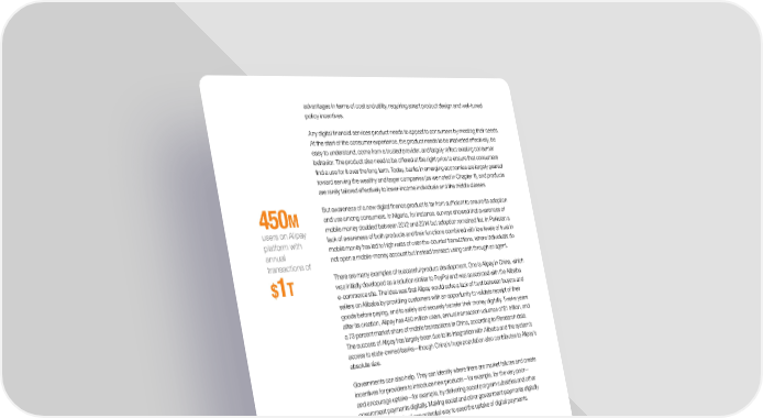 advantages in terms of cost and utility, requiring smart product design and well-tuned policy incentives. Any digital financial services product needs to appeal to consumers by meeting their needs. At the start of the consumer experience, the product needs to be marketed effectively, be easy to understand, come from a trusted provider, and largely reflect existing consumer behavior. The product also need to be offered at the right price to ensure that consumers find a use for it over the long term. Today, banks in emerging economies are largely geared toward serving the wealthy and larger companies (as we noted in Chapter 1), and products are rarely tailored effectively to lower-income individuals and the middle classes. But awareness of a new digital finance product is far from sufficient to ensure its adoption 450M and use among consumers. In Nigeria, for instance, surveys showed that awareness of users on Alipay mobile money doubled between 2012 and 2014 but adoption remained flat. In Pakistan a platform with lack of awareness of both products and their functions combined with low levels of trust in annual mobile money has led to high rates of over-the-counter transactions, where individuals do transactions of not open a mobile-money account but instead transact using cash through an agent. There are many examples of successful product development. One is Alipay in China, which $1T was initially developed as a solution similar to PayPal and was associated with the Alibaba e-commerce site. The idea was that Alipay would solve a lack of trust between buyers and sellers on Alibaba by providing customers with an opportunity to validate receipt of their goods before paying, and to safely and securely transfer their money digitally. Twelve years after its creation, Alipay has 450 million users, annual transaction volumes of $1 trillion, and a 73 percent market share of mobile transactions in China, according to iResearch data. The success of Alipay has largely been due to its integration with Alibaba and the system’s access to state-owned banks—though China’s huge population also contributes to Alipay’s absolute size. Governments can also help. They can identify where there are market failures and create incentives for providers to introduce new products—for example, for the very poor— and encourage uptake—for example, by delivering social program subsidies and other government payments digitally. Making social and other government payments digitally provides an example of one potential way to seed the uptake of digital payments. ••• Digital finance is already giving rise to a range of innovative ideas and business models. In economies as different as Kenya and China, mobile payments have enabled individuals and companies to flourish in often unexpected and unpredicted ways. Entrepreneurs across emerging economies have established businesses that leverage e-commerce platforms, selling to a global audience. This is just the start. Digital finance has a huge advantage, in that its most essential component—a mobile phone—is becoming ubiquitous. As a result, governments and businesses have an opportunity to build a vibrant digital financial services sector in a relatively short period of time—assuming they implement the these building blocks we have outlined in this report. Putting these in place is likely to be challenging, and governments may have to intervene to overcome current market failures. For some countries, the journey may be long, but it is undoubtedly worthwhile. Wide-ranging digital financial services can transform government, ushering in an era of higher-quality, more efficient service delivery. They can provide significant new markets and a much larger customer base for many types of providers, including financial institutions and telecoms companies but also e-commerce retailers and other participants in the digital economy. Best of all, they can open up a new world of economic opportunity for billions of people and hundreds of millions of businesses currently shut out of their countries’ financial systems, and in the process stimulate economic growth and job creation. McKinsey Global Institute Digital finance for all: Powering inclusive growth in emerging economies 71