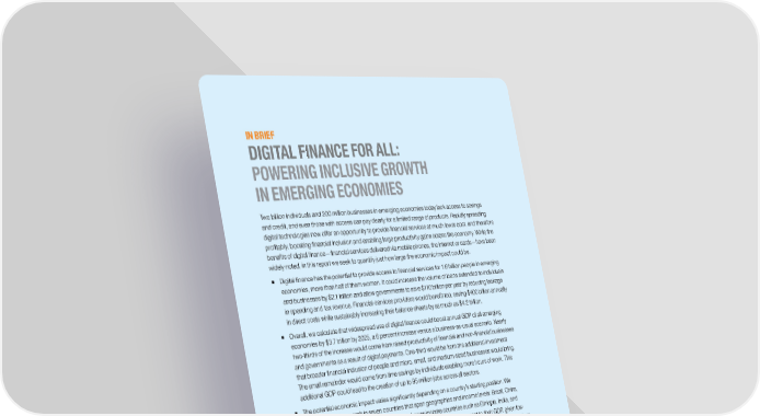 IN BRIEF DIGITAL FINANCE FOR ALL: POWERING INCLUSIVE GROWTH IN EMERGING ECONOMIES Two billion individuals and 200 million businesses in emerging economies today lack access to savings and credit, and even those with access can pay dearly for a limited range of products. Rapidly spreading digital technologies now offer an opportunity to provide financial services at much lower cost, and therefore profitably, boosting financial inclusion and enabling large productivity gains across the economy. While the benefits of digital finance—financial services delivered via mobile phones, the internet or cards—have been widely noted, in this report we seek to quantify just how large the economic impact could be. ƒ Digital finance has the potential to provide access to financial services for 1.6 billion people in emerging economies, more than half of them women. It could increase the volume of loans extended to individuals and businesses by $2.1 trillion and allow governments to save $110 billion per year by reducing leakage in spending and tax revenue. Financial-services providers would benefit too, saving $400 billion annually in direct costs while sustainably increasing their balance sheets by as much as $4.2 trillion. ƒ Overall, we calculate that widespread use of digital finance could boost annual GDP of all emerging economies by $3.7 trillion by 2025, a 6 percent increase versus a business-as-usual scenario. Nearly two-thirds of the increase would come from raised productivity of financial and non-financial businesses and governments as a result of digital payments. One-third would be from the additional investment that broader financial inclusion of people and micro, small, and medium-sized businesses would bring. The small remainder would come from time savings by individuals enabling more hours of work. This additional GDP could lead to the creation of up to 95 million jobs across all sectors. ƒ The potential economic impact varies significantly depending on a country’s starting position. We conducted field research in seven countries that span geographies and income levels: Brazil, China, Ethiopia, India, Mexico, Nigeria, and Pakistan. Lower-income countries such as Ethiopia, India, and Nigeria have the largest potential, with the opportunity to add 10 to 12 percent to their GDP, given low levels of financial inclusion and digital payments today. In comparison, middle-income countries such as China and Brazil could add 4 to 5 percent to GDP—still a substantial boost. ƒ The rapid spread of mobile phones is the game changer that makes this opportunity possible. In 2014, nearly 80 percent of adults in emerging economies had a mobile phone, while only 55 percent had financial accounts—and mobile phone penetration is growing quickly. Mobile payments can lower the cost of providing financial services by 80 to 90 percent, enabling providers to serve lower- income customers profitably. The data trail these technologies leave can enable lenders to assess the creditworthiness of borrowers, and can help businesses better manage their finances. ƒ Businesses and government leaders will need to make a concerted effort to secure these potential benefits. Three building blocks are required: widespread mobile and digital infrastructure, a dynamic business environment for financial services, and digital finance products that meet the needs of individuals and small businesses in ways that are superior to the informal financial tools they use today. Broadening access to finance through digital means can unlock productivity and investment, reduce poverty, empower women, and help build stronger institutions with less corruption—all while providing a profitable, sustainable business opportunity for financial service providers. The benefits for individuals, businesses, and governments can transform the economic prospects of emerging economies.
