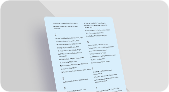Ms. Hortensia Contreras, Grupo Bimbo, Mexico Mr. Lauro Gonzalez, EAESP-FGV and Center for Mr. Leonardo Burle Gripp Cotta, Central Bank of Microfinance and Financial Inclusion Studies at FGV Brazil, Brazil (GVcemif), Brazil Mr. Giancarlo Greco, American Express (former), Brazil D Mr. Anil Kumar Gupta, MicroSave, India Dr. Yinka David-West, Lagos Business School, Nigeria Dr. Arvind Gupta, Bharatiya Janata Party, India Mr. Santiago Dawson, América Móvil, Mexico H Mr. Esaie Diei, Globacom Limited (GLO), Nigeria Mr. Ding Donghua, GOME Finance, China Syed Ammar Haider, Bank Alfalah, Pakistan Mr. Vince Mountaga DIOP, BelCash, Ethiopia Mr. Naved Hamid, Lahore School of Economics, Pakistan Mr. S V Divvaakar, Indicus Centre for Financial Mr. Jon Hartley, VisionFund International Inclusion, India Mr. Waqas ul Hasan, DFID, Pakistan Mr. Ozair Ali Dogar, Easypaisa, Telenor, Pakistan Mr. Muhammad Yar Hiraj, EP Systems/OneLoad, Pakistan Mr. James Dong, Alibaba, China Ms. Hu Anzi, CreditEase, China Mr. Ousmane Dore, Africa Development Bank, Nigeria Mr. Nadeem Hussain, Planet N, Pakistan Mr. Munir Duri, Kifiya, Ethiopia Mr. Birhanu Dutera, Federal Cooperative Agency, Ethiopia I Mr. Moazzam Iqbal, Pakistan Microfinance E Network, Pakistan Mr. Chuma Ezirim, FirstBank, FirstMonie, Nigeria Dr. Ify Isiekwe, National Bureau of Statistics, Nigeria Mr. Alejandro Islas López, Ministry of Communications F and Transportation, Mexico Mr. Yiming FEI, Bank of Langfang, China J Mr. Vicente Fenoll, Kubo.financiero, Mexico Mr. Azfar Jamal, National Bank of Pakistan, Pakistan Ms. Marusa Vasconcelos Freire, Central Bank of Mr. Syed Sohail Javaad, State Bank of Pakistan, Pakistan Brazil, Brazil Mr. Gustavo Freitas, Zuum, Brazil Mr. Adnan Javaid, United Bank Limited, Pakistan Michael J. Fuchs, Financial Sector Advisor Mr. Jiang Zeshen, China Banking Regulatory Commission, China G Mr. Juan Carlos Jiménez, The Association of Banks of Mexico, Mexico Mr. Terence Gallagher, IFC, Brazil Dr. Omobola Johnson, Alliance for Affordable Mr. Shubhashis Gangopadhyay, India Development Internet, Nigeria Foundation, India Mr. Hernán Garza, MasterCard, Mexico K Dr. Pulak Ghosh, IIM Bangalore, India Mr. Fawad Abdul Kader, Bank Alfalah, Pakistan Mr. Greg Gibb, Lufax, China Dr. Sumita Kale, Indicus Centre for Financial Ms. Bethlehem Girma, Association of Ethiopian Inclusion, India Microfinance Institutions, Ethiopia Mr. Geoff Kau, Ping An Group, China Mr. Benjamin Gleason, GuiaBolso, Brazil Mr. Nebil Kellow, First Consult, Ethiopia