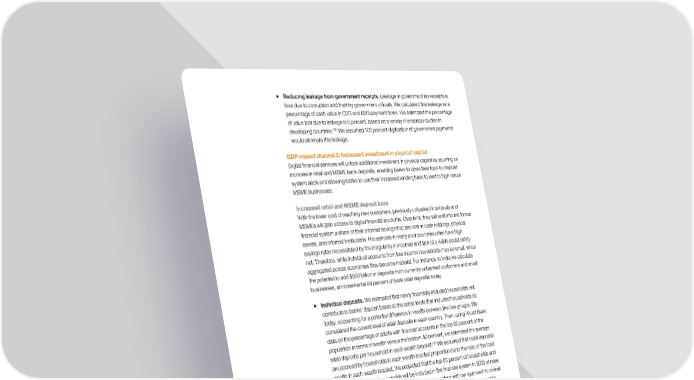 ƒ Reducing leakage from government receipts. Leakage in government tax receipts is loss due to corruption and theft by government officials. We calculated this leakage as a percentage of cash value in C2G and B2G payment flows. We estimated the percentage of value lost due to leakage is 5 percent, based on a variety of empirical studies in 108 We assumed 100 percent digitization of government payments developing countries. would eliminate this leakage. GDP impact channel 2: Increased investment in physical capital Digital financial services will unlock additional investment in physical capital by spurring an increase in retail and MSME bank deposits, enabling banks to close their loan-to-deposit system slack and allowing banks to use their increased lending base to lend to high-return MSME businesses: Increased retail and MSME deposit base With the lower cost of reaching new customers, previously unbanked individuals and MSMEs will gain access to digital financial accounts. Over time, they will shift into the formal financial system a share of their informal savings that are now in cash holdings, physical assets, and informal institutions. Households in many poor countries often have high savings rates necessitated by the irregularity in incomes and lack of a viable social safety net. Therefore, while individual accounts from low-income households may be small, when aggregated across economies they become material. For instance, in India we calculate the potential to add $800 billion in deposits from currently unbanked customers and small businesses, an incremental 64 percent of bank retail deposits today: ƒ Individual deposits. We estimated that newly financially included households will contribute to banks’ deposit bases at the same levels that included households do today, accounting for a potential difference in wealth between the two groups. We considered the current level of retail deposits in each country. Then, using World Bank data on the percentage of adults with financial accounts in the top 60 percent of the population in terms of wealth versus the bottom 40 percent, we estimated the average 109 We assumed that retail deposits retail deposits per household in each wealth bracket. are accrued by households in each wealth bracket proportionate to the ratio of the total wealth in each wealth bracket. We projected that the top 60 percent of households and bottom 40 percent of households will be included in the financial system in 2025 at rates observed today in high-income countries. This is consistent with our approach to overall financial inclusion detailed in Exhibit A1. Assuming that households will add deposits to the financial system at the same per household deposit levels observed today in each wealth bracket, we estimated the total additional deposits that newly included households will add to banks’ deposit bases (Exhibit A5). ƒ MSME deposits. Additional deposits from small and medium-sized enterprises will result from the formalization of MSMEs currently in the informal economy. We assumed that formalized MSMEs will shift the working capital they keep in their shops today into bank accounts. We also assumed that the current ratio of MSME deposits to MSME revenue will be the same for these newly formalized companies now operating in the informal sector. Using a correlation between the size of the informal economy and the increase in digital payments, we estimated the percentage of informal MSMEs that will formalize as each of our seven focus countries digitizes. We assumed that the average revenue of informal MSME revenue will be equal to the revenue of small (less than 20 employees) formal MSMEs. We then multiplied the total revenue of the newly formalized MSMEs by the deposit-to-revenue ratio of MSMEs currently operating in the formal 108 Ibid. 109 For simplicity’s sake, we assumed there are two adults per household. McKinsey Global Institute Digital finance for all: Powering inclusive growth in emerging economies 101
