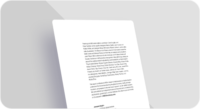 Thanks go to MGI senior editors Janet Bush, Colin Douglas, and Peter Gumbel; senior graphic designers Marisa Carder, Jason Leder, and Patrick White, and designer Margo Shimasaki; Richard Johnson, senior editor, data visualization; Tim Beacom and Karen Jones for their research expertise; Matt Cooke and Rebeca Robboy for their help on external communications; Julie Philpot, MGI’s editorial production manager; and Chelsea Grewe and Deadra Henderson in MGI practice management. Many McKinsey colleagues around the world provided invaluable input and assisted in our field research. They include Salman Ahmad, Suparna Biswas, Eduardo Bolio, Alberto Chaia, Mutsa Chironga, Violet Chung, Bobby Demissie, Yran Dias, Xiyuan Fang, Aaron Flohrs, Vijay Gosula, Feng Han, David Jiang, Bill Jones, Jawad Khan, Prasad Lad, Akash Lal, Tomás Lajous, Joshua Lan, Flavio Litterio, Anu Madgavkar, Heitor Martins, Joe Ngai, Philip Osafo-Kwaako, John Qu, Joydeep Sengupta, Daniel Sujo, Sasi Sunkara, Renny Thomas, and Nicole Zhou. This report contributes to MGI’s mission to help business and policy leaders understand the forces transforming the global economy, identify strategic locations, and prepare for the next wave of growth. As with all MGI research, this work reflects our independent views and has not been commissioned by any business, government, or other institution. We welcome your comments on the research at MGI@mckinsey.com. Jacques Bughin Director, McKinsey Global Institute Senior partner, McKinsey & Company Brussels James Manyika Director, McKinsey Global Institute Senior partner, McKinsey & Company San Francisco Jonathan Woetzel Director, McKinsey Global Institute Senior partner, McKinsey & Company Shanghai September 2016