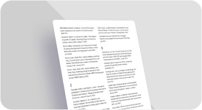 Bill & Melinda Gates Foundation, The Level One project Collins, Daryl, Jonathan Morduch, Stuart Rutherford, and guide: Designing a new system for financial inclusion, Orlanda Ruthyen, Portfolios of the poor: How the world’s April 2015. poor live on $2 a day, Princeton University Press, 2009. Bosworth, Barry P., and Susan M. Collins, “The empirics Consultative Group to Assist the Poor, Can digital of growth: An update,” Brookings Papers on Economic footprints lead to greater financial inclusion? CGAP Brief, Activity, volume 2003, number 2, 2003. July 2012. Bruhn, Miriam, and Inessa Love, The economic impact of banking the unbanked: Evidence from Mexico, World D Bank policy research working paper number 4981, June 2009. Dabla-Norris, Era, Yan Ji, Robert Townsend, and D. Filiz Brune, Lasse, Xavier Giné, Jessica Goldberg, and Dean Unsal, Distinguishing constraints on financial inclusion Yang, Commitments to save: A field experiment in rural and their impact on GDP, TFP, and inequality, NBER Malawi, World Bank policy research working paper working paper number 20821, January 2015. number 5748, January 2011. Dahlberg, Report on support to SMEs in developing Brune, Lasse, Xavier Giné, Jessica Goldberg, and countries through financial intermediaries, Dean Yang, Facilitating savings for agriculture: Field November 2011. experimental evidence from Malawi, NBER working paper Demirguc-Kunt, Asli, Leora Klapper, Dorothe Singer, and number 20946, February 2015. Peter Van Oudheu, The Global Findex database 2014: Measuring financial inclusion around the world, World Bank policy research working paper number 7255, C April 2015. Carpenter, Seth B., and Robert T. Jensen, “Household Deribie, Ebisa, Getachew Nifussie, and Fikadu Mitiku, participation in formal and informal savings mechanisms: “Filling the breach: Microfinance,” Journal of Business Evidence from Pakistan,” Review of Developmental and Economic Management, volume 1, number 1, Economics, volume 6, issue 3, 2002. January 2013. Cecchetti, Stephen G., M. S. Mohanty, and Doepke, Matthias, and Michèle Tertilt, Does female Fabrizio Zampolli, The real effects of debt, Bank for empowerment promote economic development? Centre International Settlements working paper number 352, for Economic Policy Research discussion paper number September 2011. 8441, June 2011. Centre for Retail Research, “Global retail theft barometer Duflo, Esther, “Women empowerment and economic 2011,” 2011. development,” Journal of Economic Literature, volume 50, Chaia, Alberto, Aparna Dalal, Tony Goland, Maria Jose number 4, December 2012. Gonzalez, Jonathan Morduch, and Robert Schiff, Half Duflo, Esther, Michael Kremer, and Jonathan Robinson, the world is unbanked, Financial Access Initiative framing “Nudging farmers to use fertilizer: Theory and note, October 2009. experimental evidence from Kenya,” American Economic Chen, Gregory, and Stephen Rasmussen, bKash Review, volume 101, number 6, October 2011. Bangladesh: A fast start for mobile financial services, Dupas, Pascaline, and Jonathan Robinson, “Savings CGAP Brief, July 2014. constraints and microenterprise development: Evidence Coady, David, Ian Parry, Louis Sears, and Baoping from a field experiment in Kenya,” American Economic Shang, How large are global energy subsidies? IMF Journal: Applied Economics, volume 5, number 1, 2013. working paper number 15/105, May 2015. Dupas, Pascaline, and Jonathan Robinson, “Why don’t Collins, Daryl, “Focus note: Stocks and flows—quantifying the poor save more? Evidence from health savings the savings power of the poor,” www.financialdiaries. experiments,” American Economic Review, volume 103, com, 2005. issue 4, June 2013. 108 McKinsey Global Institute Bibliography