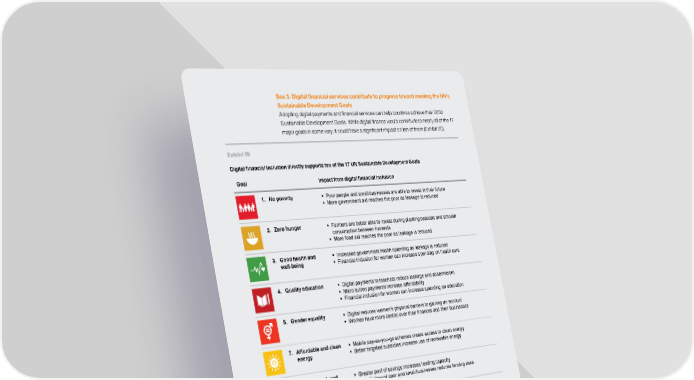 Box 5. Digital financial services contribute to progress toward meeting the UN’s Sustainable Development Goals Adopting digital payments and financial services can help countries achieve their 2030 Sustainable Development Goals. While digital finance would contribute to nearly all of the 17 major goals in some way, it could have a significant impact on ten of them (Exhibit 20). Exhibit 20 Digital financial inclusion directly supports ten of the 17 UN Sustainable Development Goals Goal Impact from digital financial inclusion 1. No poverty Poor people and small businesses are able to invest in their future More government aid reaches the poor as leakage is reduced 2. Zero hunger Farmers are better able to invest during planting seasons and smooth consumption between harvests More food aid reaches the poor as leakage is reduced 3. Good health and Increased government health spending as leakage is reduced well-being Financial inclusion for women can increase spending on health care 4. Quality education Digital payments to teachers reduce leakage and absenteeism Micro tuition payments increase affordability Financial inclusion for women can increase spending on education 5. Gender equality Digital reduces women’s physical barriers to gaining an account Women have more control over their finances and their businesses 7. Affordableand clean Mobile pay-as-you-go schemes create access to clean energy energy Better targeted subsidies increase use of renewable energy 8. Decent work and Greater pool of savings increases lending capacity economic growth Data history of poor and small businesses reduces lending risks 9. Industry, innovation Digital finance enables new business models and products and infrastructure More public and private capacity to invest in infrastructure 10. Reduced inequalities Financial inclusion gives greatest benefit to very poor people More government aid available as fraud and theft are reduced 16. Peace, justice and Digital records of financial transactions increase transparency and enable strong communities better monitoring of corruption and trafficking SOURCE: UN Sustainable Development Goals; McKinsey Global Institute analysis Box 5 McKinsey Global Institute Digital finance for all: Powering inclusive growth in emerging economies 55