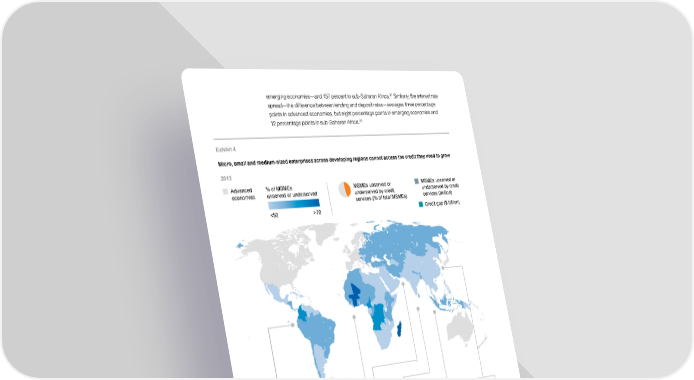 37 emerging economies—and 157 percent in sub-Saharan Africa. Similarly, the interest rate spread—the difference between lending and deposit rates—averages three percentage points in advanced economies, but eight percentage points in emerging economies and 38 12 percentage points in sub-Saharan Africa. Exhibit 4 Micro, small and medium-sized enterprises across developing regions cannot access the credit they need to grow 2013 Advanced % of MSMEs MSMEsunserved or MSMEsunserved or economies unserved or underserved underserved by credit underserved by credit services (% of total MSMEs) services (million) <50 >70 Credit gap ($ billion) Latin Africa and Eastern Europe South Southeast China America Middle East and Asia Asia Central Asia 52% 53% 51% 48% 51% 49% 27 35 11 35 39 51 $620B $528B $323B $170B $175B $338B 200 million $2.2 trillion total number of unserved or underserved MSMEs total credit gap SOURCE: SME Finance Forum; McKinsey Global Institute analysis 37 Era Dabla-Norris et al., Distinguishing constraints on financial inclusion and their impact on GDP, TFP, and inequality, NBER working paper number 20821, January 2015. 38 Ibid. DUPLICATE from ES 24 McKinsey Global Institute 1. The limited scope of finance in emerging economies today
