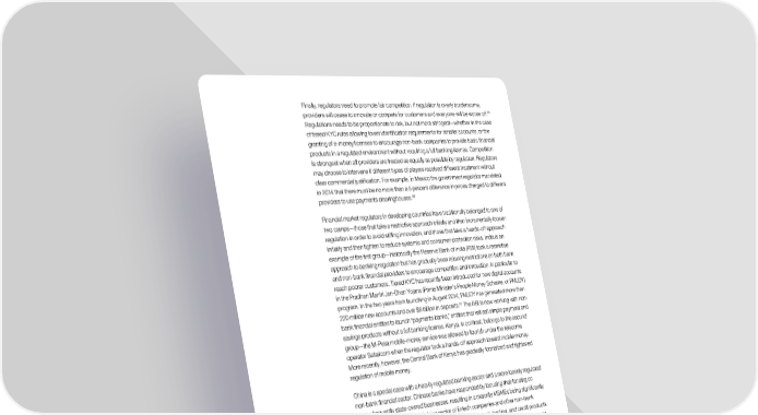 Finally, regulators need to promote fair competition. If regulation is overly burdensome, 95 providers will cease to innovate or compete for customers and everyone will be worse off. Regulations needs to be proportionate to risk, but not more stringent—whether in the case of tiered KYC rules allowing lower identification requirements for smaller accounts, or the granting of e-money licenses to encourage non-bank companies to provide basic financial products in a regulated environment without requiring a full banking license. Competition is strongest when all providers are treated as equally as possible by regulation. Regulators may choose to intervene if different types of players received different treatment without clear commercial justification. For example, in Mexico the government regulator mandated in 2014 that there must be no more than a 5 percent difference in prices charged to different 96 providers to use payments clearinghouses. Financial market regulators in developing countries have traditionally belonged to one of two camps—those that take a restrictive approach initially and then incrementally loosen regulation in order to avoid stifling innovation, and those that take a hands-off approach initially and then tighten to reduce systemic and consumer-protection risks. India is an example of the first group—historically the Reserve Bank of India (RBI) took a restrictive approach to banking regulation but has gradually been relaxing restrictions on both bank and non-bank financial providers to encourage competition and innovation, in particular to reach poorer customers. Tiered KYC has recently been introduced for new digital accounts in the Pradhan Mantri Jan-Dhan Yojana (Prime Minister’s People Money Scheme, or PMJDY) program. In the two years from launching in August 2014, PMJDY has generated more than 97 The RBI is now working with non- 220 million new accounts and over $6 billion in deposits. bank financial entities to launch “payments banks,” entities that will sell simple payment and savings products without a full banking license. Kenya, in contrast, belongs to the second group—the M-Pesa mobile-money service was allowed to flourish under the telecoms operator Safaricom when the regulator took a hands-off approach toward mobile money. More recently, however, the Central Bank of Kenya has gradually formalized and tightened regulation of mobile money. China is a special case with a heavily regulated banking sector and a more loosely regulated non-bank financial sector. Chinese banks have responded by focusing their lending on larger, frequently state-owned businesses, resulting in a majority MSMEs being significantly underserved. In response, a thriving sector of fintech companies and other non-bank financial institutions have proliferated to provide new payment, lending, and credit products to individuals and MSMEs. Over 2013 to 2016, the share of consumer transactions that are digital has increased by 80 percent. Three internet giants—Alibaba, Tencent, and Baidu— have released digital financial-services products, all of which have attracted huge uptake. For instance, 400 million users of Tencent’s online social WeChat platform have either linked a bank card to their accounts or maintained a positive account balance in the past three years, and Alibaba can now create credit scores for small businesses based on using online information. Nearly 2,000 P2P lenders have emerged to fill the credit gap. Mindful of the risks of such explosive growth, in particular in forms of credit, Chinese regulators have now started to be more active in encouraging the creation of larger, safer players by, for instance, extending banking licenses to non-bank players. 95 Jason Lamb and Sacha Polverini, Assessing risk in digital payments, Bill and Melinda Gates Foundation, February 2015; David S. Evans and Alexis Pirchio, An empirical examination of why mobile money schemes ignite in some developing countries but flounder in most, University of Chicago Coase-Sandor Institute for Law and Economics Research, paper number 723, March 2015. 96 Banco de Mexico circular 18/2014, 2014. 97 Pradhan Mantri Jan Dhan Yojana (PMJDY) website, www.pmjdy.gov.in. McKinsey Global Institute Digital finance for all: Powering inclusive growth in emerging economies 69