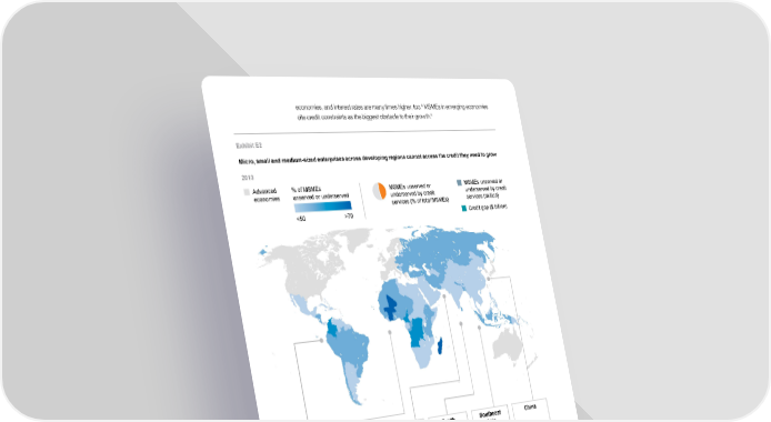 4 economies, and interest rates are many times higher, too. MSMEs in emerging economies 5 cite credit constraints as the biggest obstacle to their growth. Exhibit E2 Micro, small and medium-sized enterprises across developing regions cannot access the credit they need to grow 2013 Advanced % of MSMEs MSMEsunserved or MSMEsunserved or economies unserved or underserved underserved by credit underserved by credit services (% of total MSMEs) services (million) <50 >70 Credit gap ($ billion) Latin Africa and Eastern Europe South Southeast China America Middle East and Asia Asia Central Asia 52% 53% 51% 48% 51% 49% 27 35 11 35 39 51 $620B $528B $323B $170B $175B $338B 200 million $2.2 trillion total number of unserved or underserved MSMEs total credit gap SOURCE: SME Finance Forum; McKinsey Global Institute analysis 4 Era Dabla-Norris at al., Distinguishing constraints on financial inclusion and their impact on GDP, TFP, and inequality, NBER working paper number 20821, January 2015. REPEATS in report 5 Small and medium enterprise finance: New findings, trends and G-20/Global Partnership for Financial Inclusion progress, Global Partnership for Financial Inclusion and International Finance Corporation, 2013. 4 McKinsey Global Institute Executive summary