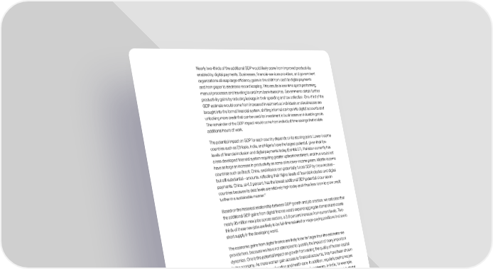 Nearly two-thirds of the additional GDP would likely come from improved productivity enabled by digital payments. Businesses, financial-services providers, and government organizations all reap large efficiency gains in the shift from cash to digital payments and from paper to electronic record keeping. This results in less time spent performing manual processes and traveling to and from bank branches. Governments obtain further productivity gains by reducing leakage in their spending and tax collection. One-third of the GDP estimate would come from increased investment as individuals and businesses are brought into the formal financial system, shifting informal savings into digital accounts and unlocking more credit that can be used for investment in businesses and durable goods. The remainder of the GDP impact would come from individual time savings that enable additional hours of work. The potential impact on GDP for each country depends on its starting point. Lower-income countries such as Ethiopia, India, and Nigeria have the largest potential, given their low levels of financial inclusion and digital payments today (Exhibit E7). Pakistan currently has a less developed financial system requiring greater upfront investment, and thus would not have as large an increase in productivity as some of its lower-income peers. Middle-income countries such as Brazil, China, and Mexico can potentially boost GDP by more modest— but still substantial—amounts, reflecting their higher levels of financial inclusion and digital payments. China, at 4.2 percent, has the lowest additional GDP potential of our seven countries because its debt levels are relatively high today and it has less room to grow credit 17 further in a sustainable manner. Based on the historical relationship between GDP growth and job creation, we calculate that the additional GDP gains from digital finance would expand aggregate demand and create nearly 95 million new jobs across sectors, a 3.5 percent increase from current levels. Two- thirds of these new jobs are likely to be full-time salaried or wage-paying positions that are in short supply in the developing world. The economic gains from digital finance are likely to be far larger than the estimates we provide here, because we have not attempted to quantify the impact of many important dynamics. One is the potential impact on growth from raising the quality of human capital in the economy. As more women gain access to financial accounts, they have been shown to spend more on nutrition, education and health care. In addition, regularly paying wages of teachers and health-care workers digitally reduces absenteeism. In India, for example, one study found that attendance rate of teachers is 90 percent in states with reliable digital 18 Fewer missed days of work salary payments, but only 60 to 80 percent in other states. improves the quality of education and health care, enhancing human capital. Second, digital payments can help governments improve targeting of services and subsidies to the poor, and therefore better meet social needs. Third, digital payments create transparency about who is evading taxes. If accompanied by stronger government enforcement efforts, this can reduce the size of the informal economy and boost overall productivity. Fourth, digital payments have already shown their potential to unlock a wide range of new business models in finance and beyond, including e-commerce and on-demand services. Taken as a whole, digital finance can accelerate progress toward meeting many of the UN’s Sustainable 19 Development Goals, leading to important societal benefits. 17 Debt and (not much) deleveraging, McKinsey Global Institute, February 2015. 18 Inclusive growth and financial security: The benefits of e-payments to Indian society, McKinsey & Company, October 2010. 19 For example, one of the Sustainable Development Goals is reducing hunger. Digital finance contributes to this goal by giving farmers financial tools to cope with income variations and smooth consumption between harvests. Another example is the climate change and clean energy goal. Digital payments make it possible for households to use pay-as-you-go methods for solar panels and other clean technologies. McKinsey Global Institute Digital finance for all: Powering inclusive growth in emerging economies 11
