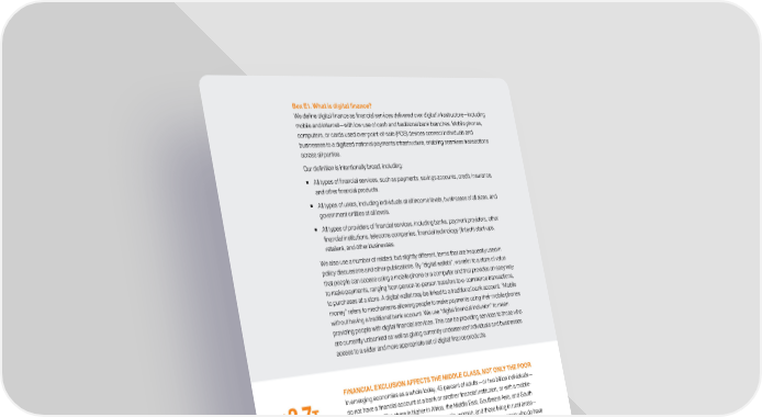 Box E1. What is digital finance? We define digital finance as financial services delivered over digital infrastructure—including mobile and internet—with low use of cash and traditional bank branches. Mobile phones, computers, or cards used over point-of-sale (POS) devices connect individuals and businesses to a digitized national payments infrastructure, enabling seamless transactions across all parties. Our definition is intentionally broad, including: ƒ All types of financial services, such as payments, savings accounts, credit, insurance, and other financial products. ƒ All types of users, including individuals at all income levels, businesses of all sizes, and government entities at all levels. ƒ All types of providers of financial services, including banks, payment providers, other financial institutions, telecoms companies, financial technology (fintech) start-ups, retailers, and other businesses. We also use a number of related, but slightly different, terms that are frequently used in policy discussions and other publications. By “digital wallets”, we refer to a store of value that people can access using a mobile phone or a computer and that provides an easy way to make payments, ranging from person-to-person transfers to e-commerce transactions, to purchases at a store. A digital wallet may be linked to a traditional bank account. “Mobile money” refers to mechanisms allowing people to make payments using their mobile phones without having a traditional bank account. We use “digital financial inclusion” to mean providing people with digital financial services. This can be providing services to those who are currently unbanked as well as giving currently underserved individuals and businesses access to a wider and more appropriate set of digital finance products. FINANCIAL EXCLUSION AFFECTS THE MIDDLE CLASS, NOT ONLY THE POOR In emerging economies as a whole today, 45 percent of adults—or two billion individuals— $3.7T do not have a financial account at a bank or another financial institution, or with a mobile- money service. The share is higher in Africa, the Middle East, Southeast Asia, and South OR 6% Asia, and is particularly high among poor people, women, and those living in rural areas— could be added to but many middle class people are also affected (Exhibit E1). Even those people who do have basic financial accounts lack access to the broad range of financial services that those in developing world developed countries take for granted, such as different types of savings accounts, loans, GDP in 2025 from 2 and insurance products. As a result, the majority of people in emerging economies rely widespread digital on informal financial solutions that are often less flexible and more expensive than formal finance alternatives—and frequently fail to deliver when needed the most. These include saving in the form of livestock, gold, or through informal savings groups, and borrowing from family, employers, or money lenders. 2 Global Findex database 2014, World Bank, April 2015. 2 McKinsey Global Institute Executive summary