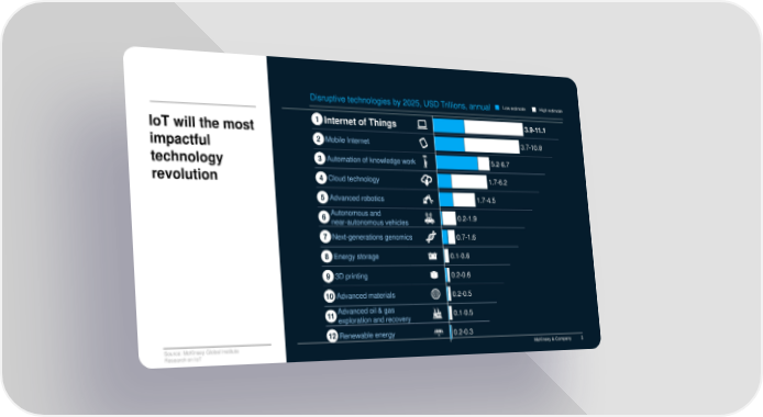 Disruptive technologies by 2025, USD Trillions, annual Lowestimate Highestimate IoT will the most 1 Internet of Things 3.9-11.1 impactful 2 Mobile Internet 3.7-10.8 technology 3 Automation of knowledge work 5.2-6.7 revolution 4 Cloud technology 1.7-6.2 5 Advanced robotics 1.7-4.5 6 Autonomous and 0.2-1.9 near-autonomous vehicles 7 Next-generations genomics 0.7-1.6 8 Energy storage 0.1-0.6 9 3D printing 0.2-0.6 10 Advanced materials 0.2-0.5 11 Advanced oil & gas 0.1-0.5 exploration and recovery 12 Renewable energy 0.2-0.3 Source: McKinsey Global Institute McKinsey & Company 5 Research on IoT