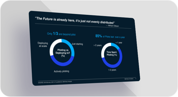"The Future is already here, it’s just not evenly distributed” —William Gibson Only 1/3are beyond pilot 85% of Pilots last over a year Deploying < 1 year Just starting > 2 years at scale Piloting vs Time Spent Deploying IoT Piloting (%) (%) Actively piloting 1-2 years SOURCE: 2018 Survey of 301 IoT practitioners; McKinsey Analysis McKinsey & Company 9
