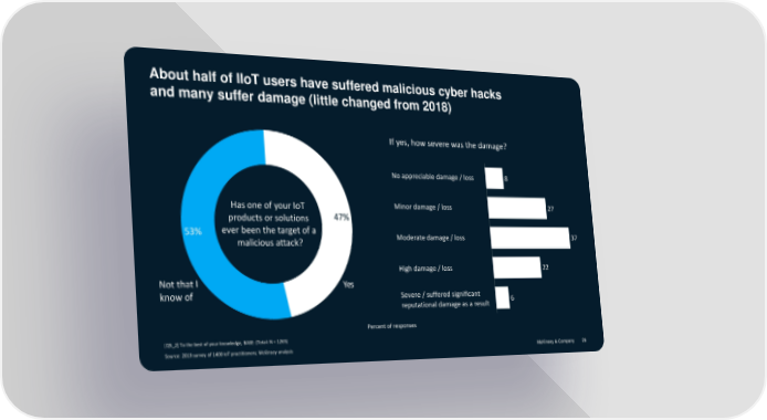 About half of IIoT users have suffered malicious cyber hacks and many suffer damage (little changed from 2018) If yes, how severe was the damage? No appreciable damage / loss 8 Has one of your IoT Minor damage / loss 27 products or solutions 47% 53% ever been the target of a Moderate damage / loss 37 malicious attack? High damage / loss 22 Not that I Yes know of Severe / suffered significant 6 reputational damage as a result Percent of responses [Q5_2] To the best of your knowledge, BASE: (Total: N = 1265) Source: 2019 survey of 1400 IoT practitioners; McKinsey analysis McKinsey & Company 29