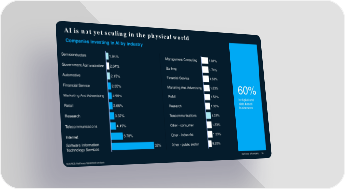 AI is not yet scaling in the physical world Companies investing in AI by industry Semiconductors 1.94% Management Consulting 1.84% Government Administration 2.04% Banking 1.74% Automotive 2.15% Financial Service 1.63% Financial Service 2.35% Marketing And Advertising 1.63% 60% Marketing And Advertising 2.55% Retail 1.53% in digital and Retail 2.66% Research 1.33% data based businesses Research 3.37% Telecommunications 1.33% Telecommunications 4.19% Other - consumer 1.33% Internet 8.78% Other - Industrial 1.33% Software Information 32% Other - public sector 0.92% Technology Services McKinsey & Company 36 SOURCE:McKinsey, Spiderbookanalysis