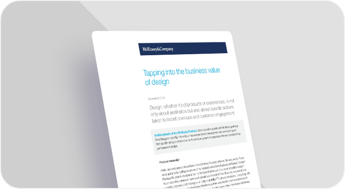 Tapping into the business value of design December 2018 Design, whether it’s of products or experiences, is not only about aesthetics but also about specific actions taken to boost revenues and customer engagement. In this episode of the McKinsey Podcast, Simon London speaks with McKinsey partners Ben Sheppard and Hyo Yeon about new research that demonstrates the dramatic impact that specific design actions have on the revenue growth of companies that are considered top performers in design. Podcast transcript Hello, and welcome to this edition of the McKinsey Podcast, with me, Simon London. Today we’re going to be talking about one of the fuzziest words in the business dictionary: “design.” Perhaps it’s clear to designers, but for the benefit of the rest of us, what actually is design? As an executive, when and how much should you invest in it? And if you do, how should you organize, measure, and manage your design capability? To discuss the issues, I caught up with Benedict Sheppard, a London-based McKinsey partner who has led some recent research into the business value of design. We were joined by Hyo Yeon, a New York–based McKinsey partner and also a practicing designer. Simon London: Hyo and Ben, thanks so much. Welcome to the podcast. Thanks for doing this. Hyo Yeon: Thank you. Ben Sheppard: Delighted to be here. Thank you. Simon London: I’m going to start with a very simple question. When we’re talking about design, Hyo, what are we talking about? Hyo Yeon: There are three core elements to design. One, obviously, is the craft, the doing of design, which is closer to artisanal, beautiful, creating artifacts, creating experiences. The next is the end product, a product or a service, or, in my world, a digital experience. All of those things are actually design. The third, which is design thinking, many people are familiar with,