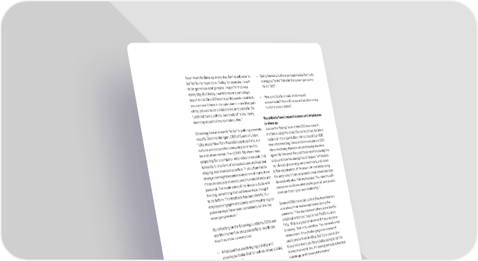 how I want to show up every day. So I’ve added a ‘to — Going forward, is there an opportunity for me to be’ list to my repertoire. Today, for example, I want manage a “to be” list with the same rigor as my to be generous and genuine. I hope I’m that way “to do” list? every day. But today, I want to make sure it stays top of mind. On a different day this week—and look, — How, practically, should I hold myself you can see it here in my calendar—I knew that part accountable? How will I ensure that others help of my job was to be collaborative and catalytic. So hold me accountable? I pick out two qualities, two kinds of ‘to be,’ every morning as part of my normal routine.” Recalibrate how I expect leaders and employees to show up Choosing how one wants “to be” is yielding concrete Just as the “being” side of the CEO has come to results. Deanna Mulligan, CEO of Guardian, says, the fore during the crisis, the same is true for other “Like many New York financial-services firms, our leaders in the organization. At his recent top-300 culture and corporate communications tend to executive meeting, Verizon Communications CEO be a bit more formal. Pre-COVID-19, when I was Hans Vestberg shared a visual showing how he’s preparing for a company-wide video or speech, that spent his time over the past three months during the formality, in the form of rehearsals and professional crisis and how his energy has changed: “Ultimately, staging, was standard practice. That culture had to my job is to give energy, empowerment, and vision change overnight because everyone’s at home. Now, to the organization. If I’m down, I’m not really using I’m more casually dressed, and it’s more intimate and the only asset I have as a leader. And I have bad days personal. I’ve made some of my videos outside with like anybody else. I tell my leaders, ‘You need to self- the dog, something that we’d never have thought assess so you know what you’re good at, and double to do before. The feedback has been terrific. Our down on that in your own leadership.’” employee engagement scores, confirmed by regular pulse surveys, have been consistently on the rise Several CEOs have told us that they have learned since going remote.” a lot about their leadership teams during the pandemic. “This environment offers some terrific By reflecting on the following questions, CEOs can empirical evidence,” says Union Pacific’s Lance use this moment as an opportunity to recalibrate Fritz. “This is a great environment if you’re prone how they show up every day: to saying, ‘Not in my sandbox.’ You can really shut others down. It’s a challenging environment if — What qualities am I bringing to being and you’re prone to be inviting, but if you can do it in showing up today that I should continue to bring this environment, you’re probably going to do it in into the future? the normal world, too. I’m seeing behaviors like that bubble up, and it’s very informative.” CEOs are noticing aspects of their people that had always been there but perhaps had gone overlooked or weren’t considered important until the pandemic helped make those characteristics more pronounced. The CEO moment: Leadership for a new era 149