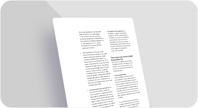 We’ve seen companies, for example, make — Ecosystems to drive adaptability. The sizable allocations of marketing budget disruptions in supply chains and offline in days and even hours, and launch new buying channels have made adaptability ecommerce businesses in a matter of weeks. crucial not just to survival but to accessing Start-up leaders establish an agile cadence opportunities quickly. In the short term, through daily team check-ins, weekly adaptability may mean how companies 30-minute CEO reviews, and biweekly work with agencies and partners, but in the hourlong sprint reviews. long-term, it will require new partnerships and non-traditional collaborations, — Human at the core. To drive rapid action, including strategic M&A. companies will need to rethink their operating model, building it around how their people work best. Our B2B Decision Maker Pulse Three steps to get started on Rapid survey research has shown that more than 50 Revenue Recovery percent of businesses find a new remote sales Capturing revenue rapidly requires taking a model to be of equal or greater effectiveness combination of actions. What those are will than the old one. Enabling people will clearly depend on each company’s situation. Top require a new set of skills and capabilities, performers, however, take three steps with from facility with tech to working remotely. rigor and discipline: Successful pivots to a remote sales model, for example, will require an entirely new level of 1. Identify and prioritize collaboration and coaching between front- Commercial leaders will need to plan for line sales reps and leadership in order to meet recovery based on a clear understanding of consumer expectations. their starting point and insights into demand patterns ahead of and during the recovery. This — Accelerate digital, tech, and analytics. It’s is crucial for knowing what to do and when. We almost become a cliché to say that the have identified more than a dozen marketing crisis has become an inflection point in the and sales activities that can capture revenue shift to digital, but the best companies are quickly (Exhibit 2). Some are more relevant to moving quickly to enhance and expand their B2C companies, while others make more sense digital channels. They’re successfully using for B2Bs. advanced analytics to combine new and innovative sources of data, such as satellite Once identified, these measures need to imaging, with their own insights to derive be rigorously assessed by their impact on “recovery signals.” EBIT and the company’s ability to execute quickly. That starts with a clear view of — Purpose-driven customer playbook. Putting the market and thoughtful forecasting of customers at the center of the business demand across channels, based on granular is a long-established principle, but post- views of the customer and of the possible coronavirus businesses will need a deep economic scenarios. These will require a recalibration of how customers make more sophisticated approach than those used decisions. Companies will need to rethink traditionally to develop deeply granular insights. decision journeys to understand what Leading organizations are using advanced customers now value and design new use analytic models with multiple sources of cases and customer experiences based on insights (for example, point-of-sale data, those insights. That means a more nuanced primary consumer research, social listening, approach to segmenting customers. Rapid Revenue Recovery: A road map for post-COVID-19 growth 31