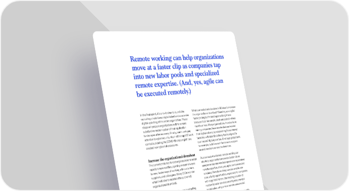 Remote working can help organizations move at a faster clip as companies tap into new labor pools and specialized remote expertise. (And, yes, agile can be executed remotely.) In the final sprint, it’s a no-brainer to launch the What can realistically be done in 90 days to increase recruiting of additional digital talent and accelerate the organizational drumbeat? Standing up a digital digital upskilling of the entire organization. These factory is largely the best approach right now steps will prepare organizations well for a more because it can be constructed and scaled in three substantive modernization of their application months or less. Many organizations, from banks to landscapes after recovery. Finally, continue to pay mining companies, have accelerated and scaled attention to cybersecurity. Much of the rapid IT work their digital delivery by establishing these internal carried out during the COVID-19 crisis might have factories, with interdisciplinary teams aligned to created new cyberrisk exposures. businesses’ digital priorities. One large global bank, for example, built five such factories to support several locations across the Americas. Increase the organizational drumbeat The current crisis has forced organizations to adapt As previously mentioned, remote working can rapidly to new realities, opening everyone’s eyes also help organizations move at a faster clip as to new, faster ways of working with customers, companies tap into new labor pools and specialized suppliers, and colleagues. Many CEOs wonder remote expertise. (And, yes, agile can be executed what it will take to maintain the quickened remotely.) Remote working can also enable new organizational drumbeat. productivity opportunities, especially for companies with large field forces. One leading provider of Companies that have led the way in adopting residential solar services recently documented flatter, fully agile organizational models have shown record sales using a more remote sales model. substantial improvements in both execution pace and productivity. This has held true during the crisis, In the next 90 days. During the first sprint, identify as we see a direct correlation between precrisis the business areas where digital-execution agile maturity and the time it has taken companies velocity is needed and map out plans for digital to launch a first crisis-related product or service. factories to support them. In parallel, assess where While many companies have at least a few agile remote work models could unleash productivity teams in place, few have successfully scaled to benefits. These two lenses should set the table hundreds of teams staffed with many more “doers” for targeted changes to the operating model. In than “checkers,” which is what’s needed to drive the second 30-day sprint, design the new models the accelerated organizational pace the crisis—and with consideration for staffing level, expertise mix, even the next normal—demands. governance, and operating procedures. Finally, in 18 What now? Ten actions to emerge stronger in the next normal September 2020