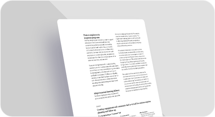 Protect employees in delivery to reduce participant risk. For example, in-person programs consider decentralizing in-person events. This Start by designing and executing a plan to support might mean replacing global kickoff events with employees that is consistent with the most multiple regional kickoff events or replacing a conservative guidelines available from leading large in-person event with multiple small-group local and global health authorities, such as the videoconferencing sessions. US Centers for Disease Control and Prevention and WHO. Communicate clearly and often with If travel restrictions mean corporate in-person employees on upcoming learning programs and facilitation teams are unavailable, consider using include specific criteria for when programs will be local employees, such as managers or alumni of deferred, modified, and canceled. previous programs. Prepare them by using a train- the-trainer approach. This entails would-be trainers If you are moving ahead with in-person learning first going through the program as participants, programs, communicate in advance the precautions being trained on how best to facilitate the sessions, you will take, such as physical distancing, alternatives and finally receiving feedback from an experienced to shaking hands, and enhanced cleaning and trainer after their first facilitating experience. sanitization procedures. For those participating remotely, ensure that they have—and are familiar Recognize that there are limits to what can be with—the available virtual collaboration tools, addressed when using virtual live sessions such including videoconferencing and cloud-based as webcasts, virtual classrooms, and video- and document sharing. audioconferencing. For example, such platforms Insights 2020 may not work well for deep socioemotional- and interpersonal-skill building. To address this shortfall, Adapting workplace learning in the time of coronavirus Exhibit 1 of 1 consider what you can do before, during, and after Adapt in-person learning delivery For those ongoing learning programs with the session to maximize its impact (exhibit). an in-person delivery component, adapt the Exhibit Creating engagement and community feel in virtual live sessions requires planning and follow-up. Tips for delivering an “in person” feel Before the session During the session After the session • Ensure you are comfortable with, • everage technology features to • Distribute any work products or and have tested, the technology keep participants engaged follow-up information as needed • Make participation easy by • eep video on, look at the webcam, • Solicit participant feedback providing local-access dial-ins, as and use gestures as in person on content, delivery, and needed, in addition to any weblink • se online tools such as polling technical eperience • Dedicate a moderator to manage and chat to gather input • Escalate any technical issues and speakers and discussion • onsider features such as virtual identify workarounds or solutions • Send materials in advance via file breakout rooms to encourage sharing, and remind participants participation prior to starting Learning and collaboration technologies for virtual delivery irtual ebcasts ideo- and audio- irtual ile ontent classrooms conferencing coaching sharing co-creation €eg, whiteboards‚ Adapting workplace learning in the time of coronavirus 39