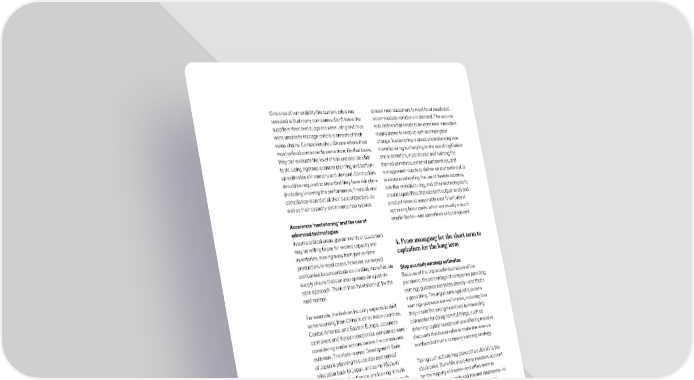 One area of vulnerability the current crisis has placed near customers to meet local needs and revealed is that many companies didn’t know the accommodate variations in demand. The second suppliers their own suppliers were using and thus is to define what needs to be done near innovative were unable to manage critical elements of their supply bases to keep up with technological value chains. Companies should know where their change. Nextshoring is about understanding how most critical components come from. On that basis, manufacturing is changing (in the use of digitization they can evaluate the level of risk and decide what and automation, in particular) and building the to do, using rigorous scenario planning and bottom- trained workforce, external partnerships, and up estimates of inventory and demand. Contractors management muscle to deliver on that potential. It should be required to show that they have risk plans is about accelerating the use of flexible robotics, (including knowing the performance, financial, and additive manufacturing, and other technologies to compliance record of all their subcontractors, as create capabilities that can shift output levels and well as their capacity and inventories) in place. product mixes at reasonable cost. It isn’t about optimizing labor costs, which are usually a much Accelerate ‘nextshoring’ and the use of smaller factor—and sometimes all but irrelevant. advanced technologies In some critical areas, governments or customers may be willing to pay for excess capacity and 4. From managing for the short term to inventories, moving away from just-in-time capitalism for the long term production. In most cases, however, we expect companies to concentrate on creating more flexible Stop quarterly earnings estimates supply chains that can also operate on a just-in- Because of the unprecedented nature of the case approach. Think of it as “nextshoring” for the pandemic, the percentage of companies providing next normal. earnings guidance has fallen sharply—and that’s a good thing. The arguments against quarterly For example, the fashion industry expects to shift earnings guidance are well known, including that some sourcing from China to other Asian countries, they create the wrong incentives by rewarding Central America, and Eastern Europe. Japanese companies for doing harmful things, such as carmakers and Korean electronics companies were deferring capital investment and offering massive considering similar actions before the coronavirus discounts that boost sales to make the revenue outbreak. The state-owned Development Bank numbers but hurt a company’s pricing strategy. of Japan is planning to subsidize companies’ relocation back to Japan, and some Western Taking such actions may stave off a quick hit to the countries, including France, are looking to build stock price. But while short-term investors account up domestic industries for critical products, such for the majority of trades—and often seem to as pharmaceuticals. Localizing supply chains and dominate earnings calls and internet chatrooms—in creating more collaborative relationships with fact, seven of ten shares in US companies are critical suppliers—for example, by helping them owned by long-term investors. By definition, this build their digital capabilities or share freight group, which we call “intrinsic investors” —look capacity—are other ways to build long-term well beyond any given quarter, and deeper than resilience and flexibility. such quick fixes. Moreover, they have far greater influence on a company’s share price over time than Nextshoring in manufacturing is about two things. the short-term investors who place such stock in The first is to define whether production is best earnings guidance. From thinking about the next normal to making it work: What to stop, start, and accelerate 87