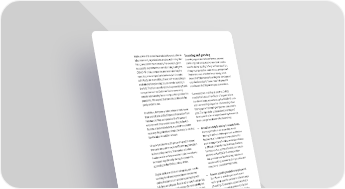 While some of that decline is related to a reduction in Learning and growing labor demand, organizations are also rethinking their Learning organizations face a tension between hiring processes more broadly. For example, given continuing cost pressures in a downturn and the successful experiments in remote hiring during the need to deliver training to help workers adapt to a COVID-19 crisis, companies are reconsidering the changing organization and business environment. need to go on campus for interviews (which would That tension was reflected in our survey, which admittedly be more difficult now, with many colleges shows that 29 percent of learning and development and universities planning to use remote learning in organizations plan to invest more in the next 12 the fall). That is an acceleration of a preexisting trend: months and that 38 percent plan to invest less. companies such as Goldman Sachs were using remote interviewing for on-campus hiring before the Our research on reskilling shows that CHROs pandemic. We expect that trend to continue in the need to think about the effects of large workforce postpandemic era. transitions being accelerated by the COVID-19 crisis and how reskilling plays a key role in helping close In addition, temporary labor, which shrank faster talent gaps while keeping employees connected to than overall jobs did (a 29 percent reduction from jobs. The agenda for postpandemic learning and February to May, compared with a 13 percent development extends beyond reskilling, however, to employment drop overall, according to the US three categories of cost-effective training: Bureau of Labor Statistics), is poised for a faster recovery. Organizations should be ready to use that — Broad-based digital training in essential skills. flexible labor in additional ways. Many organizations are expanding remote training to address challenges, such as effective Of surveyed leaders, 63 percent expect to spend leadership of remote teams (a new skill set for the same amount or more on IT-staff augmentation most managers) and building personal resilience in the coming months. The number of online in difficult circumstances. McKinsey Academy, freelancers in software and tech jobs has actually for instance, has updated its Ability to Execute increased significantly during the pandemic, platform with a COVID-19-related edition according to the Online Labour Index. that provides a series of training modules on remote working, leadership during a crisis, and Digital skills are still in short supply, and remote executional capabilities that matter. working for all employees places remote and online freelancers on a more equal footing with — Focused upskilling rooted in changing work. full-time employees. Even in other talent categories, Such forms of upskilling are function and temporary labor usually responds more quickly in a work-group specific and tied to different ways crisis recovery, as employers value flexibility during of working. For example, a sales force that is its early (and uncertain) stages. moving from a largely in-person to a hybrid remote model will need to be upskilled in the Across both permanent and contingent hiring, practices that drive remote success. The right CHROs should take a fresh look at the range of data-driven approach can bolster sales-force tools, including assessments and platforms, that are performance—and help HR departments draw a making it easier to connect people to work. There direct line from talent to revenue. are a large number of up-and-coming organizations in the prehire ecosystem, and innovation is making it According to recent McKinsey research, easier to connect people to employment based on a 77 percent of leaders indicate that retraining deeper understanding of their skills and how those salespeople is very or moderately important. match with available jobs. To do that, some companies are retraining HR says talent is crucial for performance—and the pandemic proves it 53