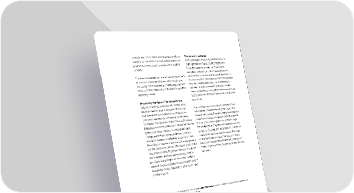 normally feel comfortable. Examples could include The reward is resilience standing up new sales channels, accelerating new- Getting the return muscle right will be the key to product launches, creating new business models, building resilience throughout the organization. or M&A. Today, for instance, investors and companies are asking increasingly probing questions about The plan-ahead team can also stress-test core parts whether their business partners can truly deliver in of the enterprise operating model by focusing on the more extreme circumstances that seem possible the supply chain’s resiliency, liquidity, assumptions over the next few years. Genuine investments in about customer demand, and the robustness of the resiliency may be an essential part of survival for operating model. many businesses, providing the cushion required by further setbacks that might be in store over the next Processing the signals: The data platform year or two. To function well, nerve centers will need to collect data from a wide range of sources (not only their Many companies are sweating the details of their own operations but also public-health agencies, return plans rather than building the capabilities policy announcements, and economic indicators), needed for a return. They are running spreadsheets synthesize this information in real time, and translate to see how many people spaced six feet apart will it into action. A nerve center with a nimble information fit in an office, planning one-way paths through system can help a company to keep up with rapid the workplace, and figuring out adaptations to rest change in the virus’s spread; to answer questions rooms, lunch rooms, and entrances. All of those are about, for example, what holiday shopping will look critical tasks, but they are not enough. The ability like without a vaccine; or to cope with a resurgence in of top leaders to refocus on the task of building the fall. Companies need an information platform that sustainable capabilities will define the companies captures such data, flags them if certain thresholds that emerge intact from the pandemic over the next are breached, and helps generate responses to two years. problems. Many companies have most of what’s needed; they can organize these resources to form an agile technology capability in a few weeks—not months or years. Mihir Mysore is a partner in McKinsey’s Houston office, Bob Sternfels is a senior partner in the San Francisco office, and Matt Wilson is a senior partner in the New York office. Copyright © 2020 McKinsey & Company. All rights reserved. 10 What now? Ten actions to emerge stronger in the next normal September 2020