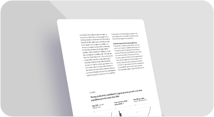 contractors. Others allow recipients to continue there are many different options to learn from. The to receive benefits if they are working part-time or role of government is to identify the best ideas, test starting a business. Governments from Germany to them, and then expand (or discard) them. Nebraska to Minneapolis are considering changes to zoning laws to encourage the construction of Institute measures to increase productivity denser and cheaper housing. Others are looking There can be no inclusive growth without economic at restricting rent increases. Making benefits growth, which means productivity has to grow, too. portable—that is, attached to individuals, rather Productivity was the foundation of the economic than workplaces—is another option. For example, success of the postwar era (Exhibit 6). Led by rising New York State’s Black Car Fund provides workers’ business investment and technology diffusion, compensation, paid for by a fare surcharge, for Germany, Japan, and other war-torn economies built livery and rideshare drivers. Lifelong training world-class industries in sectors ranging from cars accounts, funded by business, government, and and luxury goods to steel and energy. It is still true individuals, could encourage workers to invest in that only through greater productivity do wages and themselves, and also boost productivity. These are living standards improve, particularly in markets just some of the ideas that countries and states are where population growth ranges from little to none. experimenting with; we cite them to illustrate that Web <2020> Exhibit 6 Exhibit <3> of <6> Strong productivity contributed to Japan’s postwar growth, even when Strong productivity contributed to Japan’s postwar growth, even when population growth slowed after 1960. population growth slowed after Real GDP, constant Year-over-year change Real GDP per capita, 1990 $ trillion in population, % constant 1990 $ thousand 1. ‡ 1 0.„ „ 0.ƒ 1 ƒ 0 0 0 19ƒ… 19…0 19†0 19ƒ… 19…0 19†0 19ƒ… 19…0 19†0 9.4 9.6 1.9 1.1 7.4 8.4 GR, % GR, % GR, % 1Compound annual growth rate. Source: Maddison Project Dataase 010 ni ersit o€ ‚roningen 122 What now? Ten actions to emerge stronger in the next normal September 2020