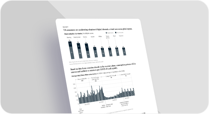 Article type and Year Article Title Exhibit X of X Exhibit 1 US consumers are accelerating adoption of digital channels, a trend seen across global regions. Digital adoption, by industry, … of digital access ‹egular users Firsttime users †an‡ing ˆntertainment ‰rocery arel tilities Šelcom Šrael Insurance 73 carriers 21 64 61 24 31 45 13 39 38 37 35 9 11 6 8 51 40 30 31 30 27 31 27 1 Note: Figures may not sum to listed totals, because of rounding. Source: McKinsey COVI1 S igital Sentiment Surey, r €–ƒ, „„ Based on data from countries already in the recovery phase, consumption patterns will be uneven and unlikely to return to pre-CO- levels uickly. Average daily China offline consumption,… Ž1„„… ˜ daily aerage consum tion in ec „1” ›rior to COVIœ1 ›rior to CŒinese uring COVIœ1 ea‡ fter COVIœ1 ea‡ 100 žunar Ne• –ear 39 79 €„ 125 „„ 1€„ 1„„ €„ „ ec „1 Ÿan „„ Feb „„ Mar „„ First šuŒan CŒinese žunar žo•ered emergency confirmed loc‡do•n Ne• –ear res onse leel in case in most localities1 šuŒan 1 On Mar ƒ, „„, 1 CŒinese roinces Žinoling ‘’„… of country’s o ulation” announced lo•ering of e idemicres onse leel. Source: MI–— McKinsey analysis he levels of remote working have skyrocketed during lockdowns and are likely to remain higher than precrisis levels for some time. Share of employees working remotely full time, … Information¥ ›rofessional and Financial Manufacturing ˆducation and ŠMŠ serices1 business serices actiities ŒealtŒ serices 84 74 70 61 ¦’€ ¦§ ¦§€ ¦€ 36 ¦¢£ 9 5 5 2 2 1 ŠMŠ ˜ tecŒnology, media, and telecom. ›reCOVI1 figures for remote•or‡ fre¡uency in sector sourced from internal surey Žunaailable in merican Šime se Surey”. ›ercentage oints. Source: merican Šime se Surey, S †ureau of žabor Statistics, n ˜1¢£— e¤ ert interie•s— ress searcŒ— McKinsey analysis 14 What now? Ten actions to emerge stronger in the next normal September 2020