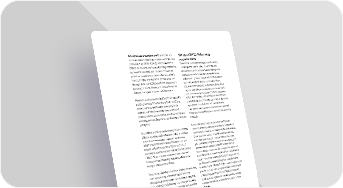 As businesses around the world postpone and Set up a COVID-19 learning- cancel in-person meetings in response to the novel response team coronavirus (or SARS-CoV-2), which causes the To create a comprehensive picture of learning COVID-19 disease, workplace learning is emerging offerings and how to adapt them to this new as one of the earliest and hardest-hit business environment, build a cross-functional response activities. Based on our observations as of early team composed of members from all relevant March, roughly one-half of in-person programs stakeholder groups. These include HR business through June 30, 2020, have been postponed or partners, learning-delivery personnel, IT and canceled in North America; in parts of Asia and platform technologists, and vendors. Establish a Europe, the figure is closer to 100 percent. regular operating cadence, and coordinate work with the company’s broader COVID-19-response However, businesses can’t afford to put capability effort. Define clear decision points and be trans- building on hold. Whether the effort is reskilling parent about the criteria for canceling or deferring at the business-unit level or a company-wide a program, including who will make the calls. aspirational transformation, companies can’t Line up the entire team on how communication of simply push the pause button on critical workplace these decisions will happen—for example, centrally learning, even as they move rapidly to put employee or locally. safety first. Conduct a rapid triage of the entire portfolio of To continue enabling and delivering value-creating learning offerings, and set priorities for what will be efforts, learning leaders have a number of tactical necessary to adapt to a virtual or digital-only format. steps they can consider to protect employees, Once you have a clear view of the entire portfolio, adapt programs and delivery, and establish and prioritize what to build. This is important because expand virtual live learning. Digital and virtual you can’t create digital versions of everything, and learning programs were already on the rise before you need to be strategic about the allocation of COVID-19 struck, and we already see a marked scarce design resources. Set triage criteria around increase in such learning programs, which many a combination of impact metrics (How critical is the younger employees embrace. topic? How soon will effects be felt? How many will be affected?) and feasibility (How suitable is the Beyond tactical steps, there are strategic measures, topic for digital delivery?). Right out of the gate, give such as exploring alternative digital learning priority to must-have programs (such as employee strategies, that managers can develop during this onboarding), and then roll out topical programs time of physical distancing. The stronger learning (such as teaching remote-working skills, remote- capabilities that emerge could stand as a positive management skills, and leadership skills in time 1 long-term outcome from this sobering period. of crisis). Six best-practice actions, ranging from the Good decision making in this initial period requires immediate and tactical to the strategic, can help appropriate information and data. We recommend maintain the momentum and benefits of workplace- developing several minimum viable products: a learning programs and help build a new foundation rolling six-week calendar of upcoming programs for effective virtual learning. These actions are and milestones, an exposure heat map (for example, establishing a learning-response team, protecting the number of affected participants by region or employees in in-person programs, adapting delivery, program type), a prioritized list of programs for promoting digital learning, exploring alternative redesigning, and a dashboard showing progress, digital strategies, and practicing and preparing for key indicators, and decision triggers. multiple outcomes. 1 This article reflects a contemporaneous perspective on how COVID-19 could and should impact workplace learning. It is based on McKinsey’s experience in delivering learning programs to our global workforce, as in well as our work supporting clients through McKinsey Academy, which is our entity for client-facing leadership development and functional capability building. 38 What now? Ten actions to emerge stronger in the next normal September 2020