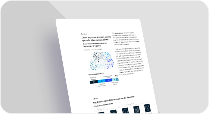 GES 2020 Supply-chain COVID Exhibit 3 of 4 Exhibit 3 Estimating a medtech company’s degree of Cluster maps reveal alternative sourcing connectiveness helped it expand its supplier options for all the materials affected. base by 600 percent, while an industrial-tools maker identified request-for-qualifications-ready Cluster map, durable speaker suppliers, suppliers for highly complex parts that it had been illustrative (n = 87 suppliers) previously unable to source. Company Common capabilities Finally, when coming out of the crisis, companies and governments should take a complete look at their supply-chain vulnerabilities and the shocks that could expose them much as the coronavirus has. Exhibit 4 describes the major sources of vulnerability. The detailed responses can reveal major opportunities—for example, using scenario analyses to review the structural resilience of critical logistics nodes, routes, and transportation Cluster characteristics, % modes can reveal weakness even when individual components, such as important airports or rail Automotive Multimedia speaker Marine hubs, may appear resilient. speakers systems audio GES 2020 27 25 25 14 9 Supply-chain COVID Mobile-phone Exhibit 4 of 3 Professional audio equipment speakers Exhibit 4 Supply-chain vulnerability occurs across five dimensions. Drivers of potential vulnerability Typical focus Full-picture focus Planning and Transportation Financial Product Organizational supplier network and logistics resiliency complexity maturity • How predictable is • How resilient is the • How much financial • re components • How proactive vs demand planning? physical-flow and flexibility does the in the products reactive is the logistics network? company have or substitutable? organiation in • How complex or increased supply- identiying and concentrated is the chain cost or • How flexible is mitigating supply- supply network, sustained the design i chain disruptions? and how resilient is disruption? components are it to disruption? no longer available? • How exposed is the • How vulnerable network to tariffs is the product to and other trade regulatory disruptions? changes? Supply-chain recovery in coronavirus times—plan for now and the future 81