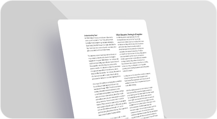 Understanding ‘how’ M&A blueprint: Putting it all together An M&A blueprint also prompts senior leaders to An M&A blueprint cannot and should not be come up with a plan for “how” they will use M&A developed based on “gut instinct” by a single to further their overarching corporate strategies. execu tive or defined post hoc to validate the theory Specifically, the M&A blueprint should delineate the behind an exciting deal. An executive or business- high-level business case and preliminary integration unit leader should lead its development but plans associated with each M&A theme. should be supported by corporate-strategy and corporate-development executives. The blue- The business case should explain how the acqui- print itself can take the form of a frequently updated ring company plans to add value to the target or and disseminated written report, or it can be a targets within a given M&A theme—for instance, the standing agenda item in every M&A and corporate- capital and operating expenditures needed (beyond strategy meeting. Regardless of format, it can the acquisition price) to integrate and scale the help decision makers assess critical factors relating asset or assets. It should also outline the operational to deal sourcing, due diligence, and integration changes and capabilities that will be required to planning before making any moves and taking steps integrate the new assets—for instance, the creation to identify targets. of a new business unit or a set of new business processes to manage an acquired digital platform. Looking back at the case of the cosmetics company, it becomes clear how an M&A blueprint could One large US healthcare company had committed have helped the organization prioritize a bunch of to a strategy of building scale in its services scattershot ideas into a comprehensive program- businesses through M&A. First, it consolidated matic M&A strategy. existing disparate service businesses under a new brand and organized them into three distinct With its market assessment, for instance, it might units: pharmacy-care services, diversified health have seen that the market for digital cosmetics is and wellness services, and data-analytics and tech- projected to grow five times faster than the market nology services. These became their three M&A for nondigital cosmetics. What’s more, market themes. Then, over a ten-year period, this program- data might have revealed that customers want and matic acquirer closed more than 60 deals, spending expect to buy cosmetics through digital channels, well over $20 billion, as it sought to fill out its and that there is no clear leader in the space. In its portfolio along these three themes. The organization self-assessment, the M&A team might also knew where it wanted to play and how. have seen a gap in the company’s product portfolio com pared with peers. And a look at boundary Of course, the business case should include a condi tions might have revealed the time and latitude preliminary integration plan for the acquired asset required to pay off initial acquisition investments, or assets that is consistent with the deal’s value- enabling the team to look beyond “base hit” deals creation thesis—for instance, all shared services with lower acquisition costs. will be absorbed by the acquirer, and the target company’s product portfolio will be cross-sold to The M&A blueprint would have led the cosmetics the acquirer’s existing customers. company to a different outcome—perhaps a laser focus on acquiring the set of assets and Through their use of the M&A blueprint, business capabilities needed to build a digital platform leaders can stay focused on those parts of the deal for selling cosmetics. that can create the most value—especially impor- tant when companies are pursuing multiple deals within the same M&A theme. What’s more, they can prepare functional leaders, suppliers, and others Spending time up front creating an M&A blueprint well in advance for the actions they may need to will pay off over the long term—particularly given take to integrate an asset or multiple assets. the volume of deals associated with a programmatic A blueprint for M&A success 63