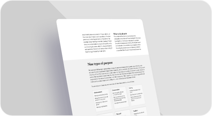 experiencing now as a result of the pandemic, or What to do about it the more recent racial-justice protests. A leader The pandemic has been a cruel reminder for previously fueled by personal achievement, for companies everywhere of how important it is to never example, might emerge from the trauma of these take healthy or motivated employees for granted. times more motivated by issues of equality or by Since individual purpose directly affects both health contributing to community. Or a leader formerly and motivation, forward-looking companies will be motivated by freedom and independence might focusing on purpose as part of a broader effort to find the tug of stability meaningful. ensure that talent is given the primacy it deserves. QWQWeb 2020eb 2020 Individual purposeIndividual purpose Nine types of purpose Exhibit 3 oSidebar 1 off 4 2 Nine types of purpose We surveyed 509 people representing a range of personal demographics (gender, age, ethnicity, and education) and occupational characteristics (industry, sector, and role). We asked them about the type and We surveyed Œ0Ž people representin a rane of personal deoraphis ‘ender‹ ae‹ ethniity‹ and intensity of their life values by having them rate the importance of a series of statements, each related to eduation’ and oupational harateristis ‘industry‹ setor‹ and role’“ We asked the about the type a value that academic research has found to be universal. Statistical analysis of the results showed that and intensity of their life values by havin the rate the iportane of a series of stateents‹ eah respondents’ life values clustered in one of nine categories. Taken together, our results suggest that an related to a value that aadei researh has found to be universal“ Statistial analysis of the results individual’s purpose maps to one of the nine—or is formed by combinations of them. shoed that respondents’ life values lustered in one of nine ateories“ Šaken toether‹ our results suest that an individual’s purpose aps to one of the nine—or is fored by obinations of the“ The nine types of purpose, and examples of their characteristics, are as follows: Achievement Conservation Caring avin a sense of authority Workin aainst threats elpin the people lose ein the ost influential to the environent to e person in any roup aisin aareness of the Sarifiin for y loved ones avin hih status and iportane of preservin ein responsive to the poer the environent needs of y faily and avin a hih inoe arin for the environent friends Freedom Respect Tradition ‚earnin thins Not bein shaed espetin y ulture’s for yself in front of others history ƒorin y †voidin huiliation ‰ratiin the rituals of on opinions y ulture or reliion hoosin y ‰reservin the established on oals values of y ulture or reliion Enjoyment Stability Equality and justice avin ne and espetin authority ‚istenin to people ho different experienes fiures are different than I …oin on adventures avin order and Šryin to understand avin exiteent stability in soiety people‹ even hen in life †dherin to standard I disaree ith the rules Ensurin everyone is treated fairly Igniting individual purpose in times of crisis 137