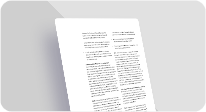 the rework effort would be justified to solve — Use advanced statistical forecasting tools to quality issues or whether remanufacture with generate a realistic forecast for base demand. used stock could address supply issues — Integrate market intelligence into product- — parts in transit should be evaluated to see what specific demand-forecasting models. steps can be taken to accelerate their arrival— particularly those in customs or quarantine — Ensure dynamic monitoring of forecasts in order to react quickly to inaccuracies. — supply currently with customers or dealers should be considered to see if stock could be With many end customers engaging in shortage bought back or transparency could be created buying to ensure that they can claim a higher for cross-delivery fraction of whatever is in short supply, businesses can reasonably question whether the demand Assess realistic final-customer demand signals they are receiving from their immediate A crisis may increase or decrease demand for customers, both short and medium term, are particular products, making the estimation of realistic realistic and reflect underlying uncertainties in final-customer demand harder and more important. the forecast. Making orders smaller and more Businesses should question whether demand signals frequent and adding flexibility to contract terms they are receiving from their immediate customers, can improve outcomes both for suppliers and their both short and medium term, are realistic and customers by smoothing the peaks and valleys reflect underlying uncertainties in the forecast. The that raise cost and waste. A triaging process that demand-planning team, using its industry experience prioritizes customers by strategic importance, and available analytical tools, should be able to find margin, and revenue will also help in safeguarding a reliable demand signal to determine necessary the continuity of commercial relationships. supply—the result of which should be discussed and agreed upon in the integrated sales- and operations- Optimize production and distribution capacity planning (S&OP) process. Armed with a demand forecast, the S&OP process should next optimize production and Additionally, direct-to-consumer communication distribution capacity. Scenario analysis can be channels, market insights, and internal and external used to test different capacity and production databases can provide invaluable information in scenarios to understand their financial and assessing the current state of demand among your operational implications. customers’ customers. When data sources are limited, open communication with direct customers Optimizing production begins with ensuring can fill in at least some gaps. With these factors in employee safety. This includes sourcing and mind, forecasting demand requires a strict process engaging with crisis-communication teams to to navigate uncertain and ever-evolving conditions communicate clearly with employees about successfully. To prepare for such instances infection-risk concerns and options for remote and effectively, organizations should take the home working. following actions: The next step is to conduct scenario planning to — Develop a demand-forecast strategy, which project the financial and operational implications includes defining the granularity and time of a prolonged shutdown, assessing impact based horizon for the forecast to make risk-informed on available capacity (including inventory already decisions in the S&OP process. in the system). To plan on how to use available Supply-chain recovery in coronavirus times—plan for now and the future 79