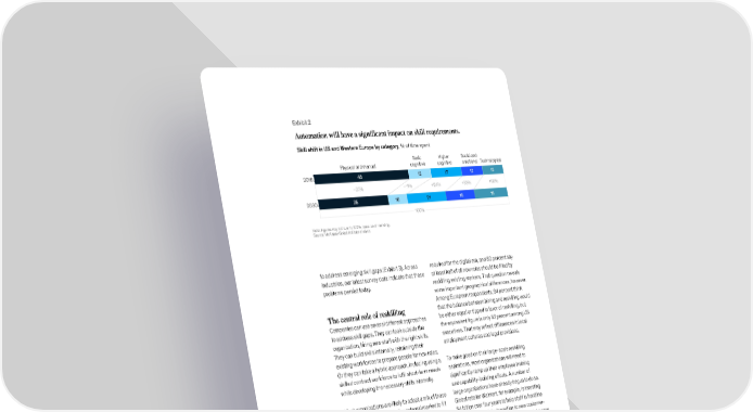 Web <2020> Exhibit <2> of <5> Exhibit 2 Automation will have a significant impact on skill requirements Automation will have a significant impact on skill requirements. Skill shift in US and Western Europe by category, % of time spent asic €iger Social and ysical and manual cognitie cognitie emotional ecnological 01 48 12 17 12 12 –„% –1„% …†% …‚‚% …‡ˆ% 0‚0 35 10 21 16 1 100% Note: Figures may not sum to 100%, because of rounding. Source: McKinsey Global nstitute analysis to address emerging skill gaps (Exhibit 3). Across required for the digital era, and 80 percent say industries, our latest survey data indicate that these at least half of all new roles should be filled by problems persist today. reskilling existing workers. That question reveals some important geographical differences, however. Among European respondents, 94 percent think The central role of reskilling that the balance between hiring and reskilling would Companies can use several different approaches be either equal or tipped in favor of reskilling, but to address skill gaps. They can look outside the the equivalent figure is only 62 percent among US organization, hiring new staff with the right skills. executives. That may reflect differences in local They can build skills internally, retraining their employment cultures and legal provisions. existing workforces to prepare people for new roles. Or they can take a hybrid approach, including using a To make good on their large-scale reskilling skilled contract workforce to fulfil short-term needs aspirations, most organizations will need to while developing the necessary skills internally. significantly ramp up their employee training and capability-building efforts. A number of Most organizations are likely to adopt a mix of those large organizations have already begun to do so. models. They may look to the external market to fill Global retailer Walmart, for example, is investing certain specialized, highly technical roles such as $4 billion over four years to help staff in frontline data scientists, while aiming to fill new frontline roles, and back-office jobs transition to new customer- such as robot controllers and production-exception service-oriented roles. E-commerce giant Amazon handlers, from their existing workforces. We believe has pledged to spend $700 million on technology that ongoing shifts in societal attitudes will increase training by 2025 to help employees move to the expectation that companies do more to retain higher-skill jobs. Professional-services company and retrain their current workers wherever possible. ManpowerGroup has entered a partnership with education company Pearson and others to upskill Executives in our survey are broadly united in the 130,000 workers over the next five years. view that their organizations have a significant role to play in the skill transition. Two-thirds of It may take several years for these global reskilling respondents think that corporations should take programs to pay back, but they are visible and the lead in the development of the new skills important investments. Some companies are Building the vital skills for the future of work in operations 69