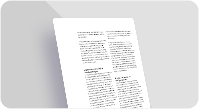 own pace. Also consider small (potentially virtual) intentional, meaningful interactions. Finally, support group projects to drive engagement, connectivity, a seamless learning experience from first contact to and application. last and ensure the same learning experience for all participants. Finally, it is important in these rapidly evolving times to reinforce the link between business outcomes As organizations explore the longer-term impli- and longer-term capability building. Learning cations of an increasingly digital environment for doesn’t occur only in one-off, discrete events; it workplace learning, it may be worth considering should be thought of as part of broader learning (or reconsidering) nonmainstream technology journeys that last 12 to 18 months and tie clearly to solutions that could reduce the need for face-to-face business outcomes. Travel restrictions may affect interaction. Some examples include virtual-reality in-person learning programs in today’s environment, training simulations and higher-end moderated but capability building needs to continue in order to virtual classrooms. All of these can enable new and advance long-term goals. different ways to engage learners. Implementing such solutions may take longer than other action items we previously listed, and companies will have Explore alternative digital- to weigh possible outcomes against the evolving learning strategies long-term implications of events such as COVID-19 As organizations increasingly promote their existing on their workplace learning. portfolios of digital-learning options, a handful indicate that they are also considering migrating Practice and prepare for some existing in-person training programs to an all-digital format. Such efforts go beyond merely multiple outcomes applying existing technology solutions to offer In any extraordinarily uncertain environment, virtual classrooms. Rather, they represent a more scenario-planning techniques should be part fundamental rethinking of the learning experience of any approach. A cross-functional COVID-19 to enable collaborative, interactive social-learning learning-response team should focus on practicing experiences for groups of learners. Digital-learning decision making and communication under a providers recognize that COVID-19 is a catalyst for variety of potential scenarios. Is the virus seasonal? this transition and are looking to help their corporate Is it possible that travel restrictions may be lifted customers accelerate their transformation. Some by May or so? If so, the team might consider are even offering reduced or complimentary prebooking post-May capacity to deliver programs services to help encourage new customers to then—perhaps with generous cancellation policies accelerate such a transition. attached. Similarly, if demand for digitally delivered learning shows a sustained increase, the team Adhering to several principles can help migrate an should make sure it understands the underlying in-person course to a fully digital experience. Start capacity needs to deliver it and to address any by reframing the “learning problem” as a design technology limitations in advance. opportunity and rethink the learner’s end-to-end experience as a designer would. Set priorities for To get a sense of how such planning can play out, the essential learning objectives and focus intently consider evaluating the scenarios described in on selecting the content that will meet them. Design “COVID-19: Implications for business,” available for shorter interactions and provide more time on McKinsey.com, and establish a plan for what between sessions to strengthen learning. Focus on workplace learning looks like under each. Practicing human connections whenever possible, creating responses under different assumptions will enable Adapting workplace learning in the time of coronavirus 41