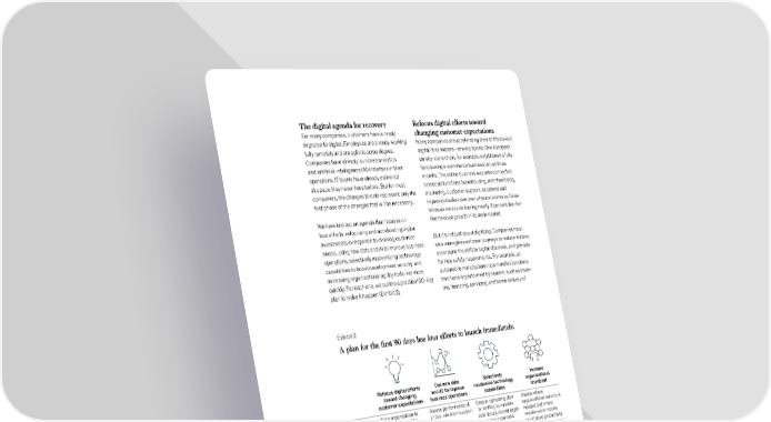 The digital agenda for recovery Refocus digital efforts toward For many companies, customers have already changing customer expectations migrated to digital. Employees are already working Many companies are accelerating their shifts toward fully remotely and are agile to some degree. digital-first models—at warp speed. One European Companies have already launched analytics variety-store chain, for example, established a fully and artificial-intelligence (AI) initiatives in their functioning e-commerce business in just three operations. IT teams have already delivered months. The online business was interconnected at a pace they never have before. But for most across all functions (warehousing, merchandising, companies, the changes to date represent only the marketing, customer support, et cetera) and first phase of the changes that will be necessary. improved basket size over physical stores by three times as well as delivering nearly 3 percent like-for- We have laid out an agenda that focuses on like revenue growth in its main market. four efforts: refocusing and accelerating digital investments in response to evolving customer But it’s not just about digitizing. Companies must needs, using new data and AI to improve business also reimagine customer journeys to reduce friction, operations, selectively modernizing technology accelerate the shift to digital channels, and provide capabilities to boost development velocity, and for new safety requirements. For example, an increasing organizational agility to deliver more automobile manufacturer now handles functions quickly. For each one, we outline a practical 90-day GES 2020 traditionally performed by dealers, such as trade- plan to make it happen (Exhibit 2). ins, financing, servicing, and home delivery of COVID Digital Exhibit 2 of 3 Exhibit 2 A plan for the first 90 days has four efforts to launch immediately. Refocus digital efforts Use new data Selectiely ncrease 1 toward changing and A to improe modernie technology organiational customer expectations usiness operations capailities drumeat Sprint 1: Align organization to Assess performance of Create rightsizing plan Assess where days 129 new digital priorities critical decision-support for shifting to variable organizational velocity is models cost structure and begin needed and where assessing cyberrisks remote-work models could drive productivity Sprint 2: Bring digital channels ecalibrate andor et up cloud-based data eploy new models days 9 to parity or better vs rebuild models platform and automate leveraging agile and competition software-delivery pipeline remote Sprint : aunch new digital evelop net-generation Begin strengthening pskill organization days 9 offerings or channels data sets and models for technology talent bench for accelerated digital optimal performance world 1 Artificial intelligence. The COVID-19 recovery will be digital: A plan for the first 90 days 15