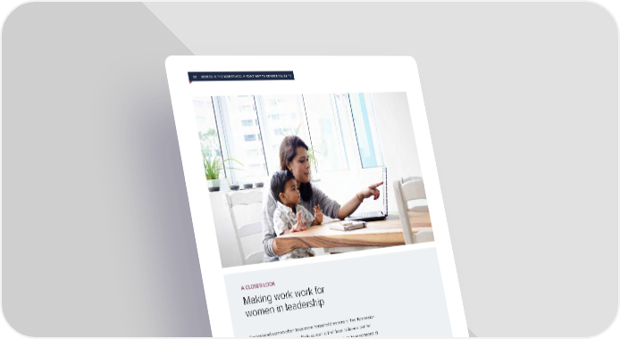 53 | WOMEN IN THE WORKPLACE: A ROAD MAP TO GENDER EQUALITY A CLOSER LOOK Making work work for women in leadership Senior-level women often have more household responsibilities than senior- level men. They are twice as likely as men at their level to have a partner who works full-time, which means they are far less likely to have someone at home focused primarily on the household and the kids. And when women in leadership have partners, they are five times more likely than men in the same situation to do all or most of the household work. So perhaps not surprisingly, among senior-level employees who don’t want to be top executives, 42 percent of women say it’s because it would require too much of their families, compared to 35 percent of men.
