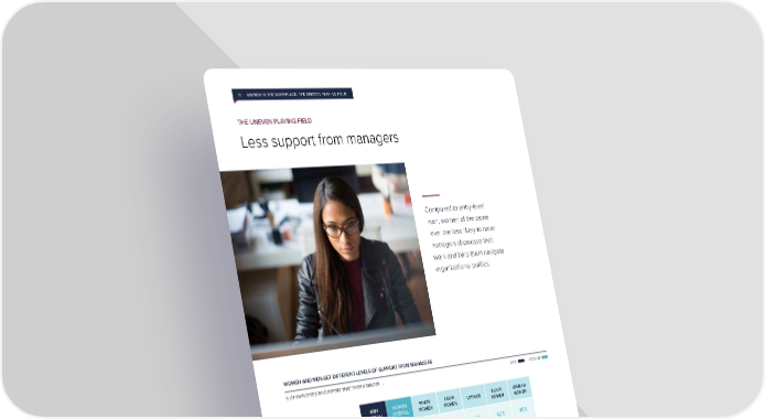 11 | WOMEN IN THE WORKPLACE: THE UNEVEN PLAYING FIELD THE UNEVEN PLAYING FIELD Less support from managers Compared to entry-level men, women at the same level are less likely to have managers showcase their work and help them navigate organizational politics. WOMEN AND MEN GET DIFFERENT LEVELS OF SUPPORT FROM MANAGERS % OF EMPLOYEES WHO REPORT THAT THEIR MANAGER . . . MEN WOMEN MEN WOMEN WHITE ASIAN LATINAS BLACK LESBIAN OVERALL OVERALL WOMEN WOMEN WOMEN WOMEN Provides the resources 49% 45% 47% 44% 43% 42% 45% I need to succeed Helps me navigate 41% 37% 39% 32% 30% 25% 35% organizational politics Creates opportunities for 45% 42% 43% 44% 40% 35% 43% me to showcase my work Promotes my 46% 44% 46% 40% 39% 35% 44% contributions to others Socializes with me 55% 47% 48% 53% 45% 35% 46% outside of work Helps me balance work 44% 46% 48% 46% 44% 39% 39% and personal demands