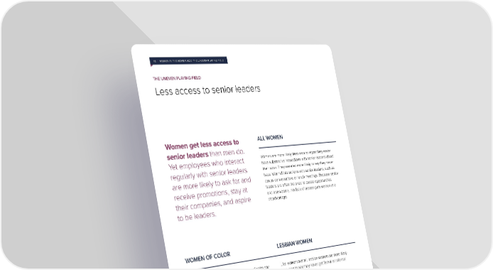 12 | WOMEN IN THE WORKPLACE: THE UNEVEN PLAYING FIELD THE UNEVEN PLAYING FIELD Less access to senior leaders Women get less access to ALL WOMEN senior leaders than men do. Yet employees who interact Women are more likely than men to report they never have substantive interactions with senior leaders about regularly with senior leaders their work. They are also more likely to say they never are more likely to ask for and have informal interactions with senior leaders, such as casual conversations or lunch meetings. Because senior receive promotions, stay at leaders are often the ones to create opportunities their companies, and aspire and open doors, this lack of access puts women at a disadvantage. to be leaders. WOMEN OF COLOR LESBIAN WOMEN Compared to white women, more women of color say Like women overall, lesbian women are more likely they never interact, formally or informally, with senior than men to say they never get formal or informal leaders. In particular, Black women get the least access access to senior leaders. to senior leaders.