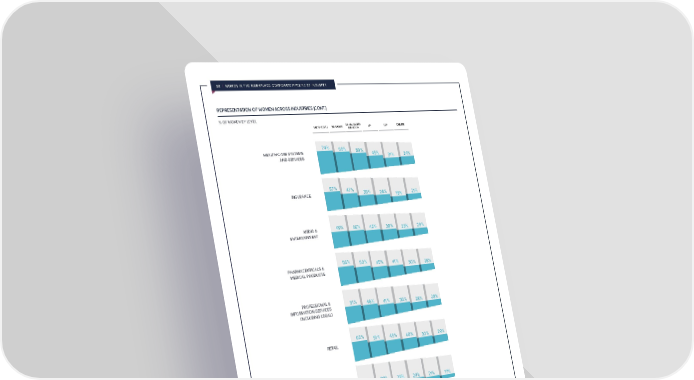 58 | WOMEN IN THE WORKPLACE: CORPORATE PIPELINE BY INDUSTRY REPRESENTATION OF WOMEN ACROSS INDUSTRIES (CONT.) % OF WOMEN BY LEVEL ENTRY LEVEL MANAGER SR. MANAGER/ VP SVP DIRECTOR HEALTH-CARE SYSTEMS 74% 69% 59% AND SERVICES 45% 31% 34% 57% 47% 35% INSURANCE 28% 18% 21% MEDIA & 49% 46% 43% 38% 29% 29% ENTERTAINMENT PHARMACEUTICALS & 56% 50% 45% 41% MEDICAL PRODUCTS 30% 28% PROFESSIONAL & 51% 48% 41% INFORMATION SERVICES 38% 28% 28% (INCLUDING LEGAL) 60% 51% 43% 40% RETAIL 32% 29% TECHNOLOGY: 37% 33% 29% 24% SOFTWARE 21% 17% TECHNOLOGY: 34% 28% 22% 19% HARDWARE 14% 16% IT SERVICES AND 41% 31% TELECOM 24% 20% 14% 11% TRANSPORTATION, 57% 40% LOGISTICS, AND 34% 30% 18% 14% INFASTRUCTURE